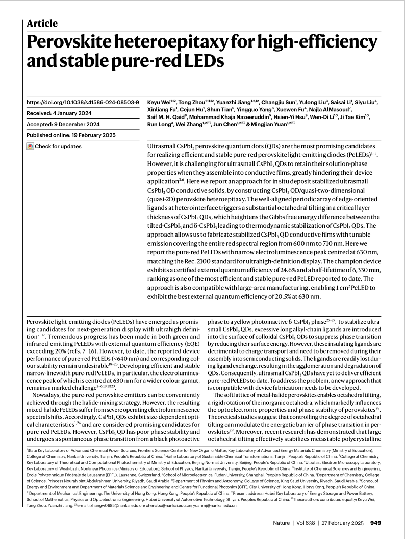 该研究针对新型钙钛矿超高清显示技术中纯红光CsPbI3钙钛矿量子点材料相稳定性差这一世界难题,率先提出“外延异质结界面应力操控”策略,首次利用全溶液法实现钙钛矿范德华外延异质结的大面积原位可控制备,并结合先进的低剂量球差透射电子显微镜技术,成功揭示钙钛矿外延异质结构的界面应力对量子点晶格结构的调控机制,突破材料稳定性与器件性能双重瓶颈,研发出高效率与高稳定性兼备的纯红光钙钛矿电致发光器件(LED),为下一代超高清显示技术发展提供了关键技术支撑。周峒博士为本文共同第一作者。中国科学院陈军院士、南开大学化学学院袁明鉴教授、章炜研究员为该论文通讯作者。南开大学化学学院为本文通讯单位,英国上市公司365储能与动力电池湖北省重点实验室为本文合作单位之一。