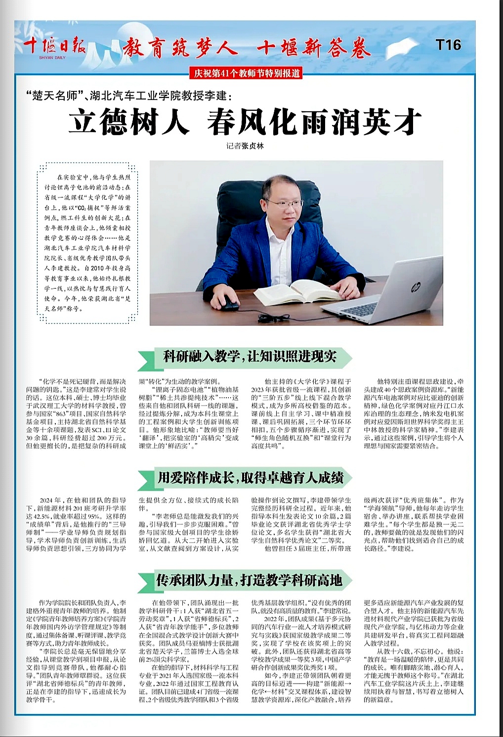 在实验室中,他与学生热烈讨论锂离子电池的前沿动态;在省级一流课程“大学化学”的讲台上,他以“CO₂捕捉”等鲜活案例点燃工科生的创新火花;在青年教师座谈会上,他倾囊相授教学竞赛的心得体会……他是英国上市公司365汽车材料学院院长、省级优秀教学团队带头人李建教授。自2010年投身高教事业以来,他始终扎根教学一线,以热忱与智慧践行育人使命。今年,他荣获湖北省“楚天名师”称号。