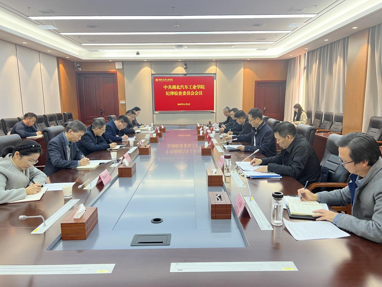 本网讯(文/图 钱坤)11月4日下午,校纪委在产教大楼三楼多功能会议室召开会议,集中学习党的二十届四中全会精神,传达学习上级纪委相关会议文件精神,审议相关议题。党委副书记、纪委书记、监察专员陈建平出席并主持会议。