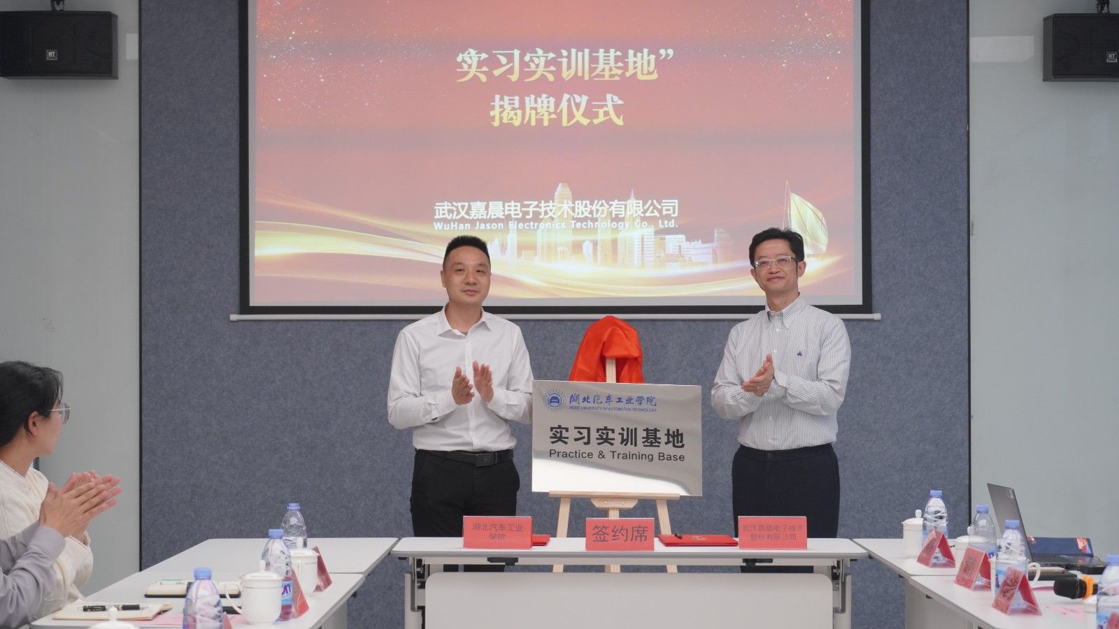 在武汉嘉晨,双方就学生实习就业、共建实验室等展开深入座谈,英国上市公司365实习生分享实习心得。现场签订产学研战略合作框架协议,双方共同为实习实训基地揭牌。