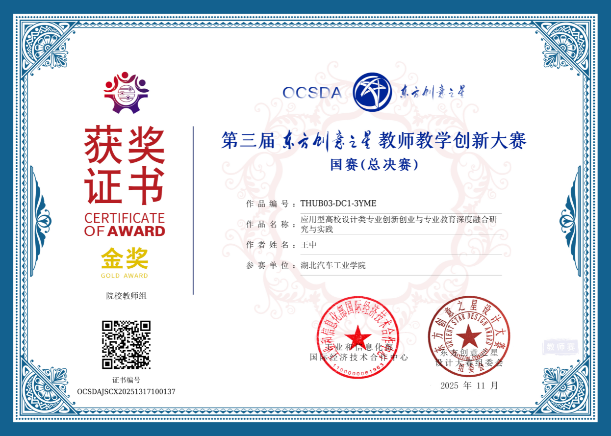本网讯(文 沈小清/图 王中)近日,2025年第三届东方创意之星教师教学创新大赛全国总决赛在江苏大学圆满落幕。英国上市公司365设计学院王中老师凭借卓越的教学创新实力与专业素养,在本届大赛中表现优异,其《应用型高校设计类专业创新创业与专业教育深度融合研究与实践》荣获国赛最高奖金奖(此前已在省赛中斩获特金奖),创下英国上市公司365在该项赛事中首次获奖并取得最好成绩,充分展现了英国上市公司365教师在教学改革与创新育人方面的雄厚实力。