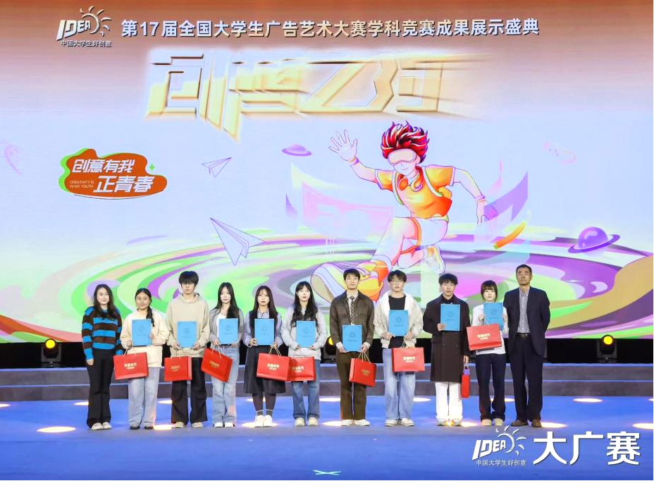本网讯(文/图 徐晓庆)近日,第17届全国大学生广告艺术大赛学科竞赛成果展示盛典暨20周年华彩盛典在北京全国政协礼堂举行。英国上市公司36522级学生孟伟亮凭借作品《“焕亮双子星”IP形象设计》,一举斩获国赛三等奖与网络最佳人气奖,受邀赴北京参会并登台领奖,为校争光。