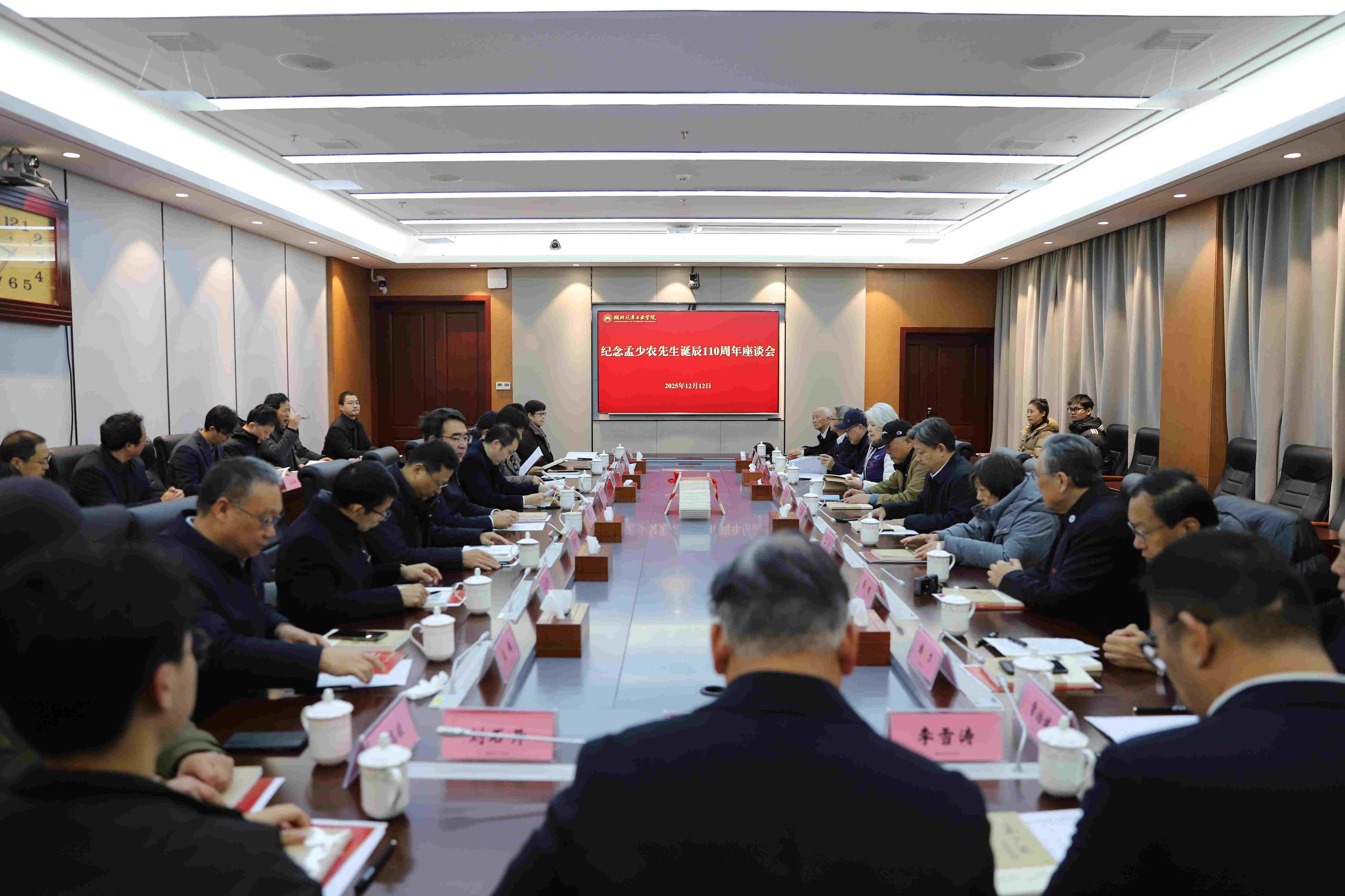本网讯(文/何鑫 图/邓玉洁)12月12日上午,学校在产教大楼三楼多功能会议室举行座谈会,纪念孟少农先生诞辰110周年。孟少农先生女儿孟运、女婿张超、儿子孟颀、儿媳方芬,东风汽车集团有限公司区域管理中心主任丁巍,校友代表东风电子科技股份有限公司总经理韩力、东风越野车传动设计总工程师汪振晓,全体校领导、离退休教师代表、在校师生代表、职能部门负责人代表齐聚一堂,共同缅怀孟少农先生为中国汽车工业作出的光辉业绩和卓越贡献,学习其崇高品德和务实作风。座谈会由党委副书记、校长李涛主持。