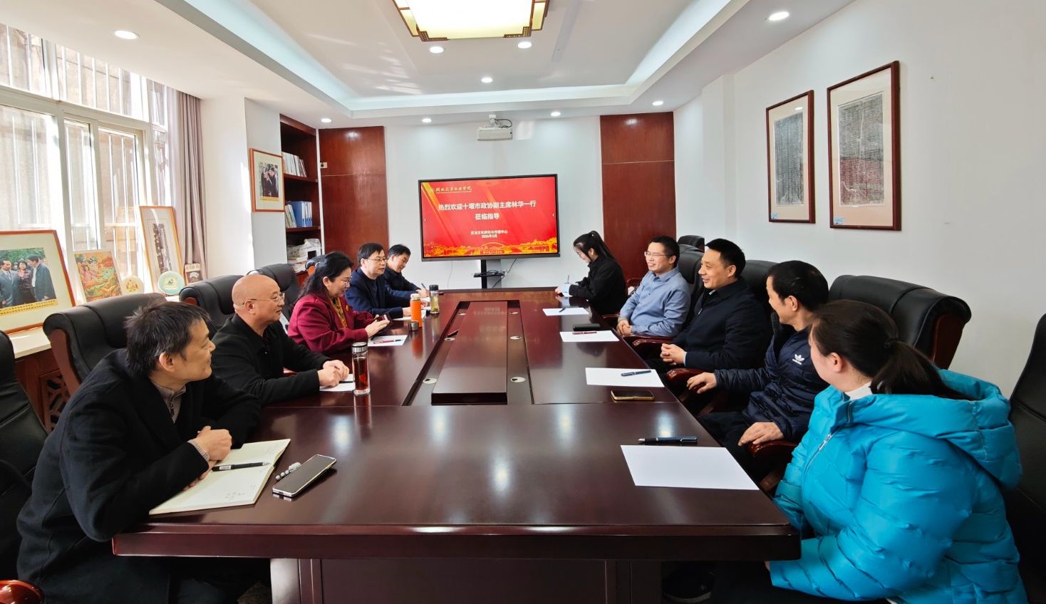 本网讯(文/图 王莽莽)3月11日,十堰市政协副主席林华一行来校调研。校党委常委、副校长王文山参加活动,并陪同参观武当文化研究与传播中心与统战研究基地。