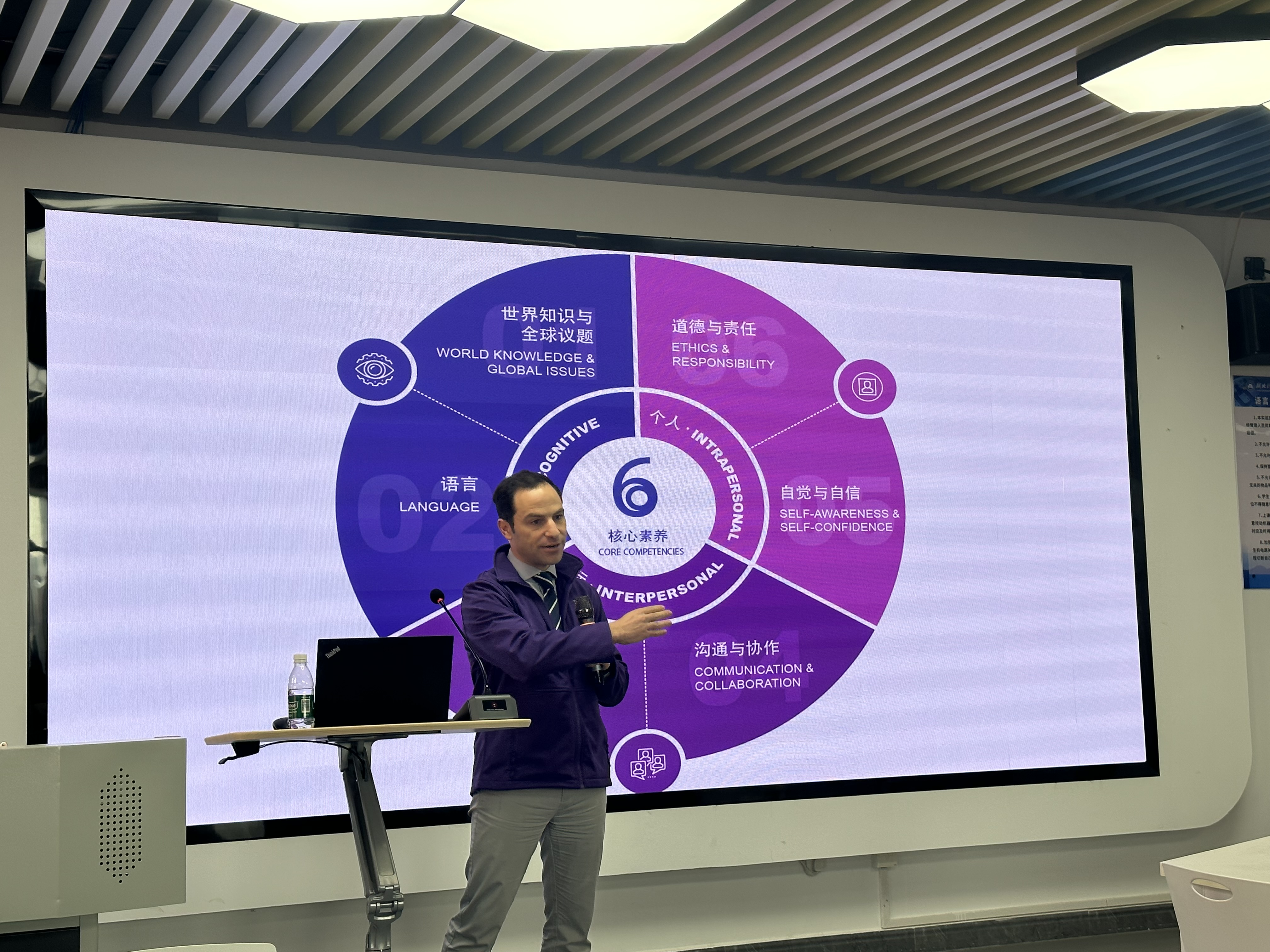 本网讯(文 陈琼/图 刘可欣、张艺璇)12月29日下午,清华大学语言教学中心专家司马云(John Paul Christopher Grima)应邀来校,于产教大楼SX301作题为“大学英语教学能力提升”的专题讲座。讲座由外语外贸学院教学院长王辰晖主持,学院领导班子及全体语言教师参与学习交流。