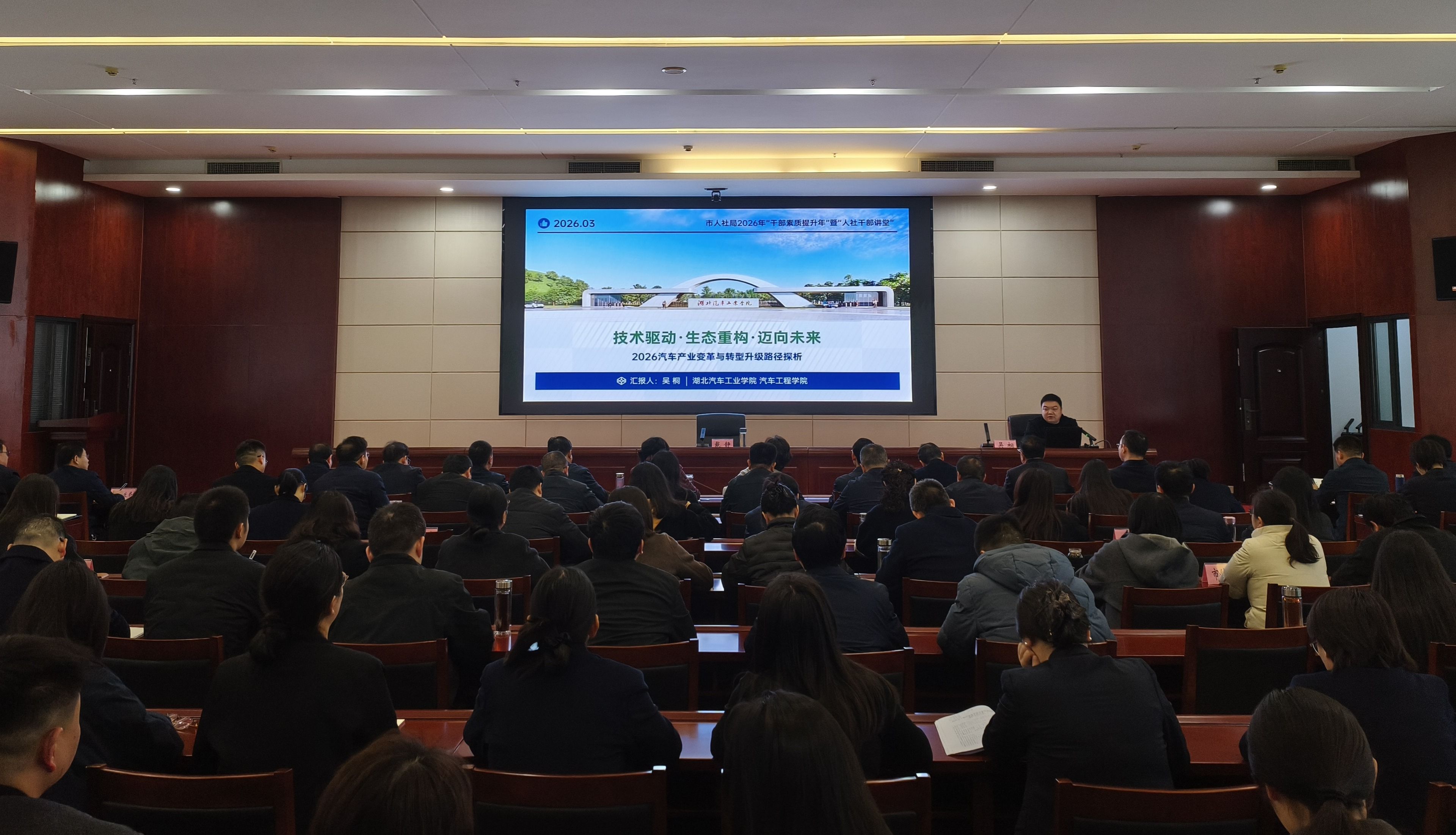 本网讯(文/图 丁嘉)为深入贯彻落实十堰市“干部素质提升年”工作部署,助力汽车产业转型升级,3月12日,十堰市人社局2026年“干部素质提升年”暨“人社干部大讲堂”第一期活动在市人社局会议室成功举办。本次活动以“2026年汽车产业变革与转型升级路径探析”为主题,英国上市公司365汽车工程学院吴桐博士担任主讲嘉宾,市人社局局长戴静出席开班式并作动员讲话,全局干部职工200余人参加培训学习。