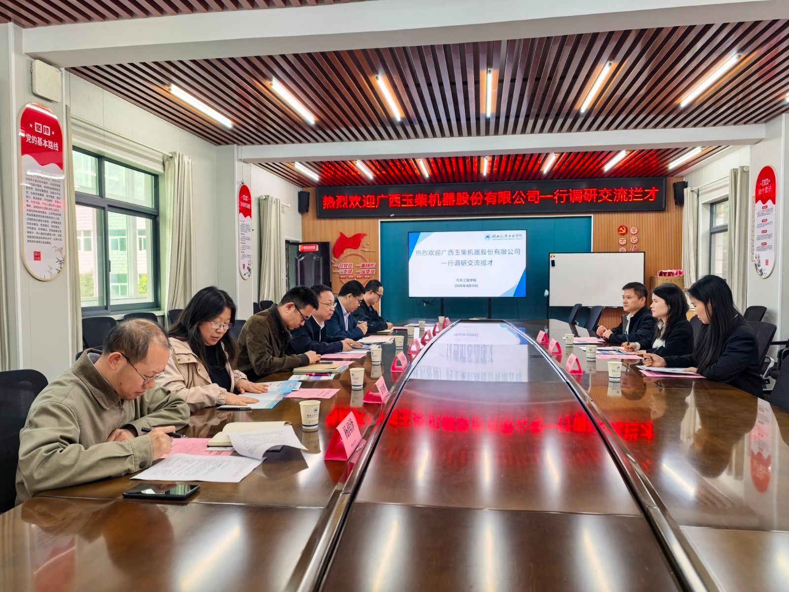 本网讯(文/图 陈超)4月14日,广西玉柴股份有限公司招聘科科长刘芷谷一行三人莅临学校,开展校企合作交流及校园招聘宣讲活动。汽车工程学院党委书记李建忠、副院长董焱章、院长助理王天田及相关专业专任教师参加了活动。