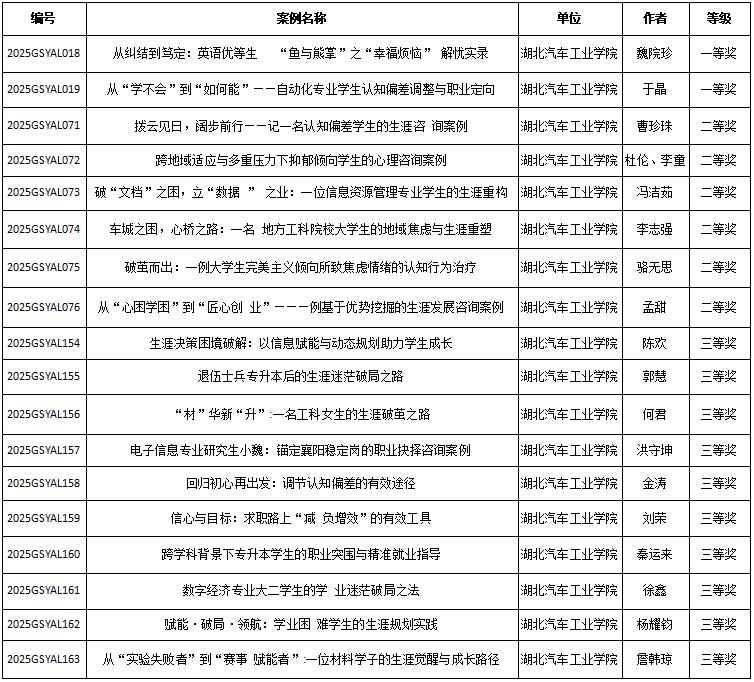 据悉,全省学校生涯咨询与心理咨询案例征集由湖北省生涯教育研究会于2025年9月底启动,旨在遴选一批流程规范、效果明显、具有借鉴推广价值的个体咨询案例,探索符合学生特点的生涯咨询和心理咨询范式,促进教师队伍专业化建设,更好服务学生发展。经过全省学校申报、专家组评审,共评出2025年生涯咨询和心理咨询获奖优秀案例359个,其中高等教育案例234个,基础教育案例125个。(审稿 陈雪刚)