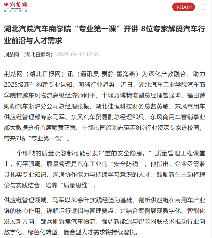 【荆楚网】湖北汽院汽车商学院“专业第一课”开讲 8位专家解码汽车行业前沿与人才需求
