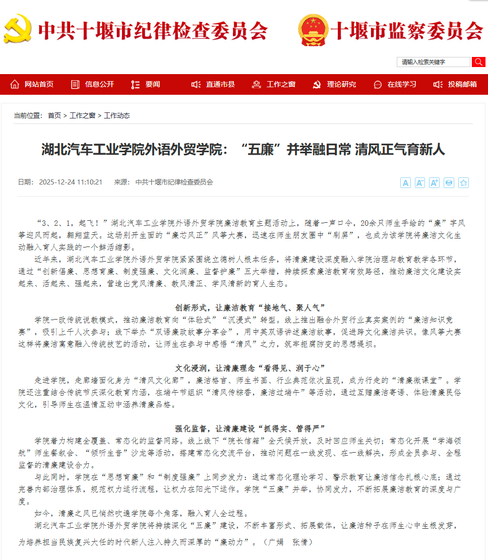【十堰市纪委网站】英国上市公司365外语外贸学院:“五廉”并举融日常 清风正气育新人