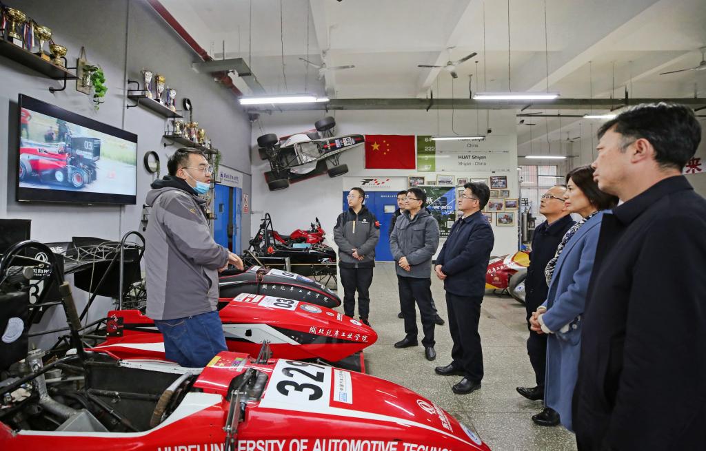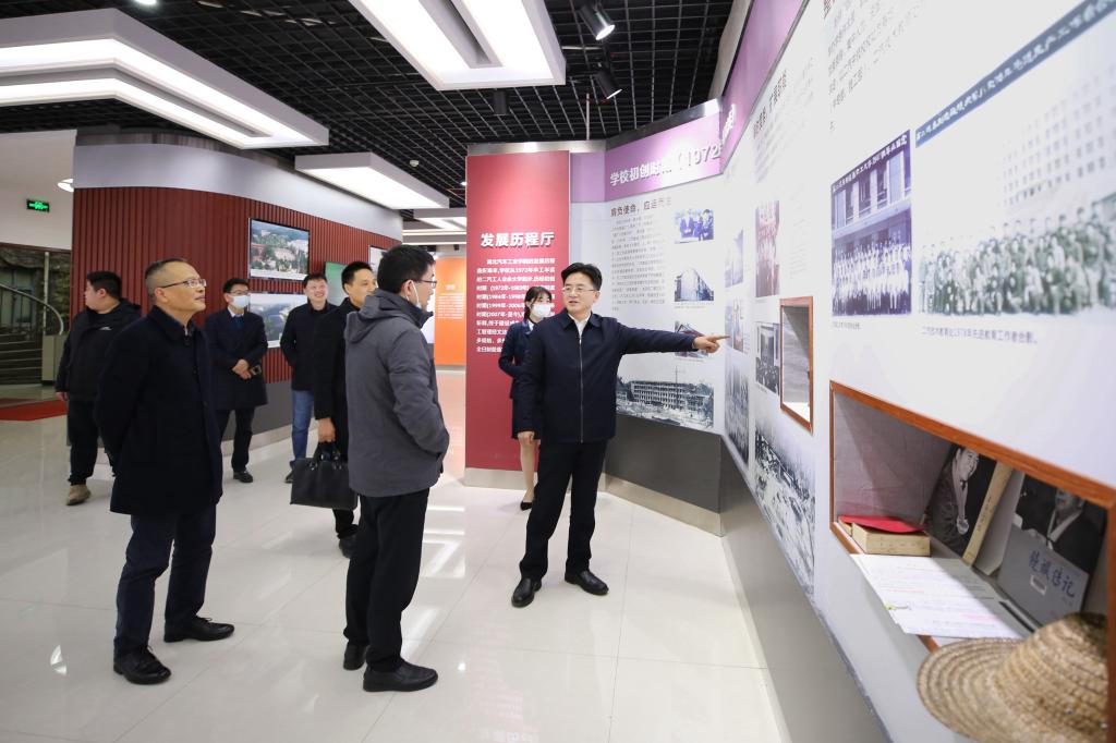 座谈交流会后,湖北省电力装备有限公司党委常委、董事长万青一行在党委副书记、校长张文学、院办公室主任王文山的陪同下参观了校史馆和东风HUAT车队。