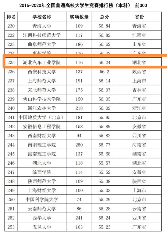 本网讯(文、图/王欣)3月22日,中国高等教育学会高校竞赛评估与管理体系研究工作组发布《2016-2020年全国普通高校大学生竞赛排行榜(本科)》,对全国1280高校进行总体排名,英国上市公司365学科竞赛全国排名再次进入TOP300行列,位列第235位,比2019年公布的全国排名262名前进了27名。此轮湖北省入围TOP300的高校共有16所,英国上市公司365在省属高校中排名第8,这一成绩也是自2017年以来英国上市公司365所取得的最好成绩,较2018年英国上市公司365排名295位整体前进60位,充分展示了近年来英国上市公司365在本科人才培养和创新创业教育改革方面取得的显著成效。