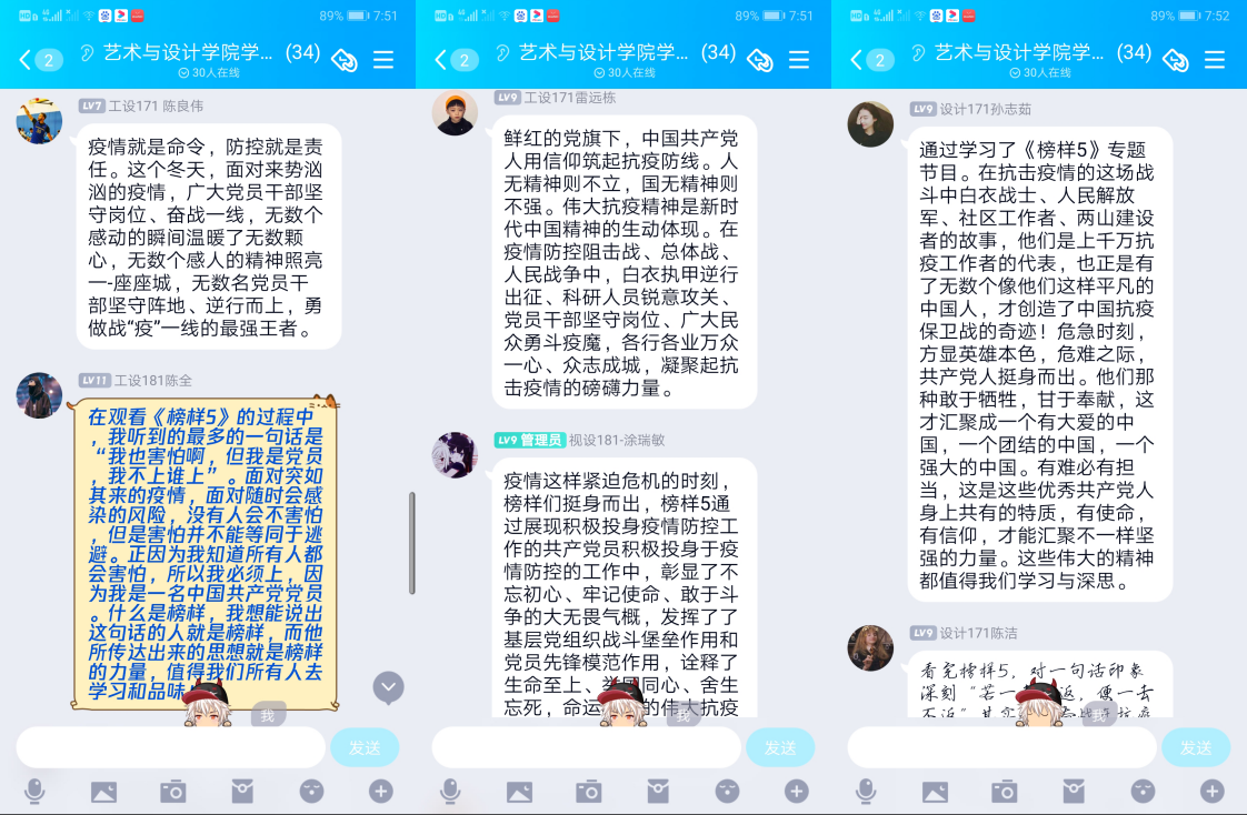 材料学院学生一支部书记詹韩琼说;“不论是脱贫攻坚还是抗击疫情,都是我们党员同志的服务地、历练场,作为学生党员,我们要以他们为榜样,向先进看齐,学习这些优秀党员和党组织的先进事迹以及展现出来的伟大精神,在实践中增长才干,不断成长,为早日成为一名优秀共产党员而努力。”