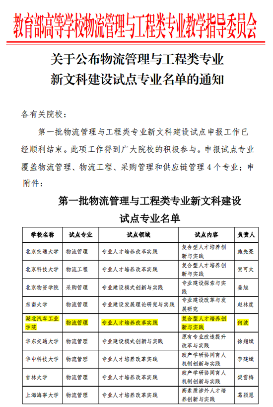 本网讯(文/贾静、何波)近日,教育部高等学校物流管理与工程类专业教学指导委员会公布49个专业点列入第一批物流管理与工程类专业新文科建设试点专业名单,英国上市公司365物流管理专业成功获批为新文科建设试点专业。