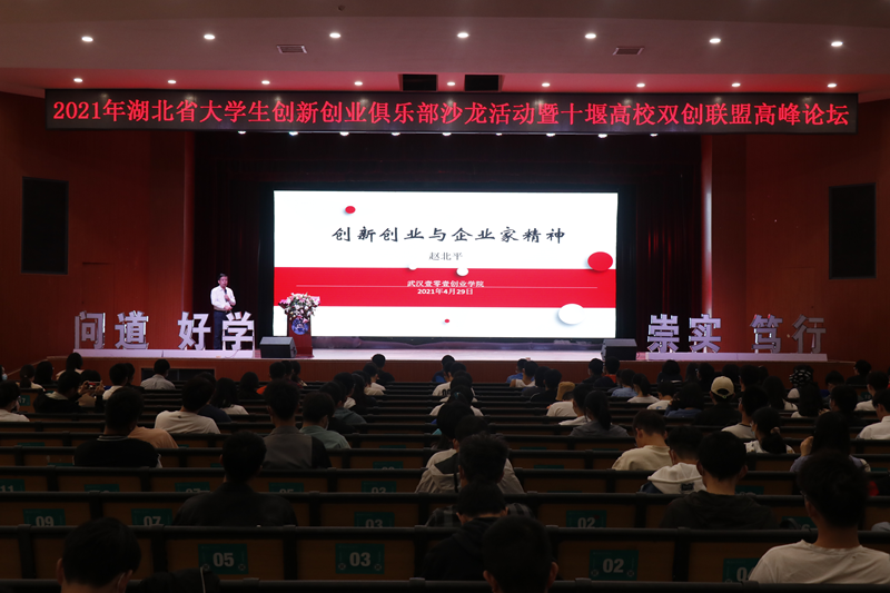 英国上市公司365学工部部长陶伟在大礼堂主持高峰论坛第三分会场“2021年湖北省大学生创新创业俱乐部沙龙”专题活动,武汉工商学院副校长赵北平做了《创新创业与企业家精神》的专题报告,湖北省高等学校毕业生就业指导服务中心蔡晨磊部长、张杰和陆艺副部长出席本次报告会,十堰高校近700名学生代表聆听了精彩报告。
