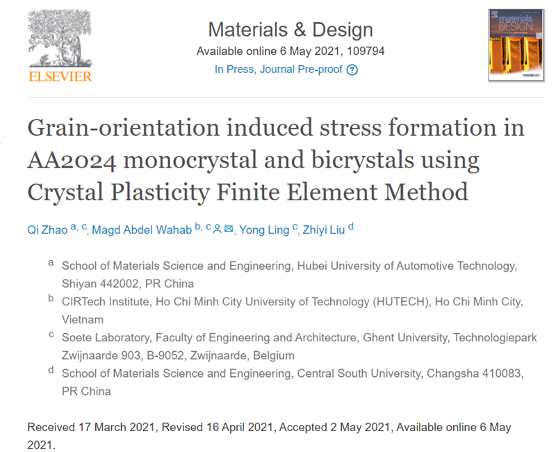 本网讯(文/赵齐)最近,国际材料科学顶级期刊《Materials & Design》(中科院1区top期刊,IF=6.289),刊登了英国上市公司365材料学院和比利时根特大学有限元实验室的联合研究论文《Grain-orientation induced stress formation in AA2024 monocrystal and bicrystals using Crystal Plasticity Finite Element Method》。英国上市公司365材料学院赵齐副教授为文章第一作者,比利时根特大学工程系Magd Abdel Wahab教授为文章的通讯作者。参与合作研究的还包括比利时根特大学工程系凌勇研究员及中南大学材料学院刘志义教授。