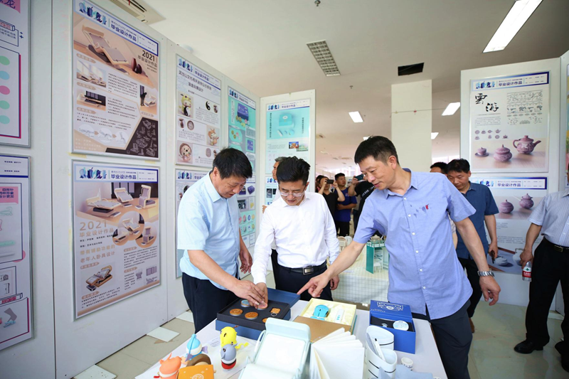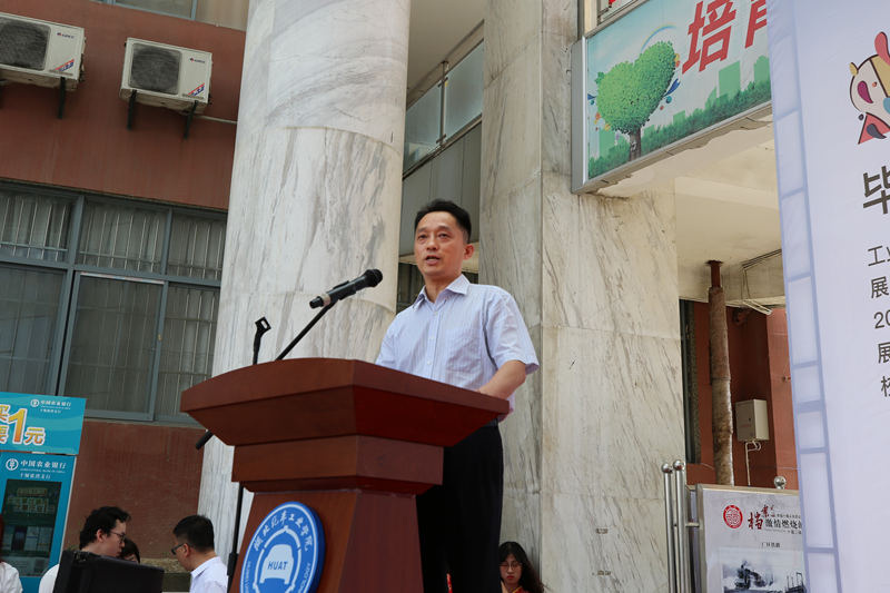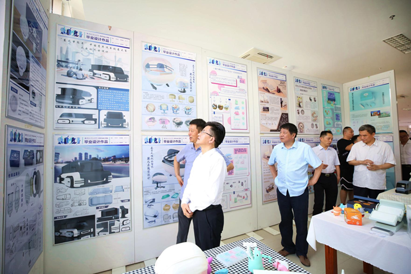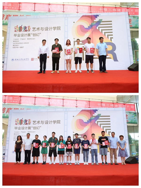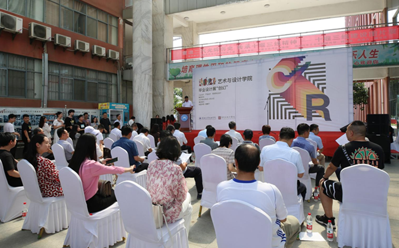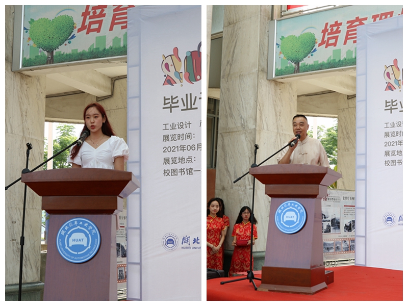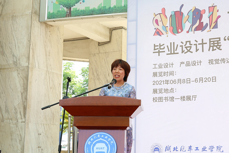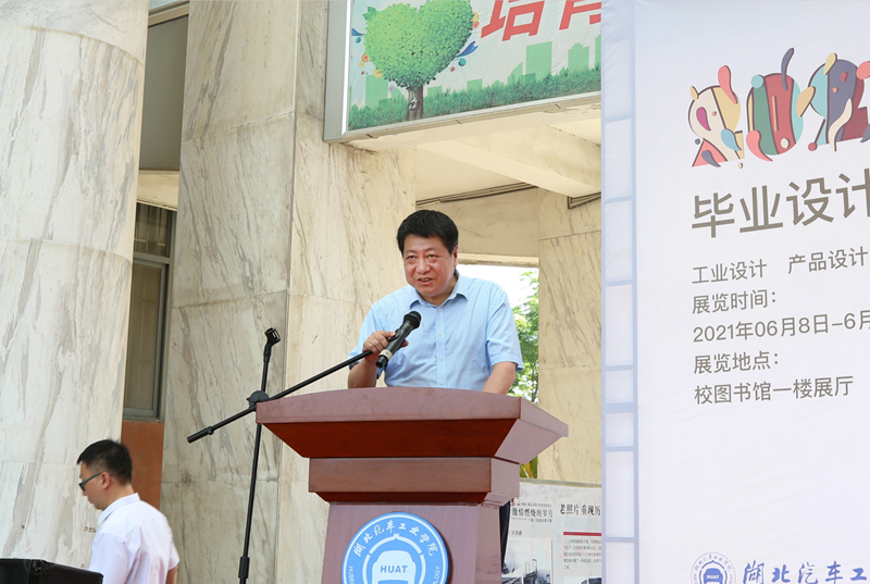 本网讯(文/陈旭红 图/广娟)6月8日下午,艺术与设计学院2021届毕业设计作品展开幕式在逸夫图书馆前广场举行。校党委书记程红兵、党委副书记、校长张文学、党委副书记杨立志、纪委书记、监察专员林雪荣、副校长张红霞、工会主席陈海峰,学校部分职能部门、二级学院负责人,湖北工业职业技术学院艺术设计学院姚强院长,湖北愚公移山文化传播有限公司李刚总经理,驰天汽车股份有限公司副董事长黄玉舜等出席了开幕仪式。艺术与设计学院全体教职工、2021届本科毕业生及在校生代表参加了开幕式。开幕式由学院分党委副书记马晓涛主持。