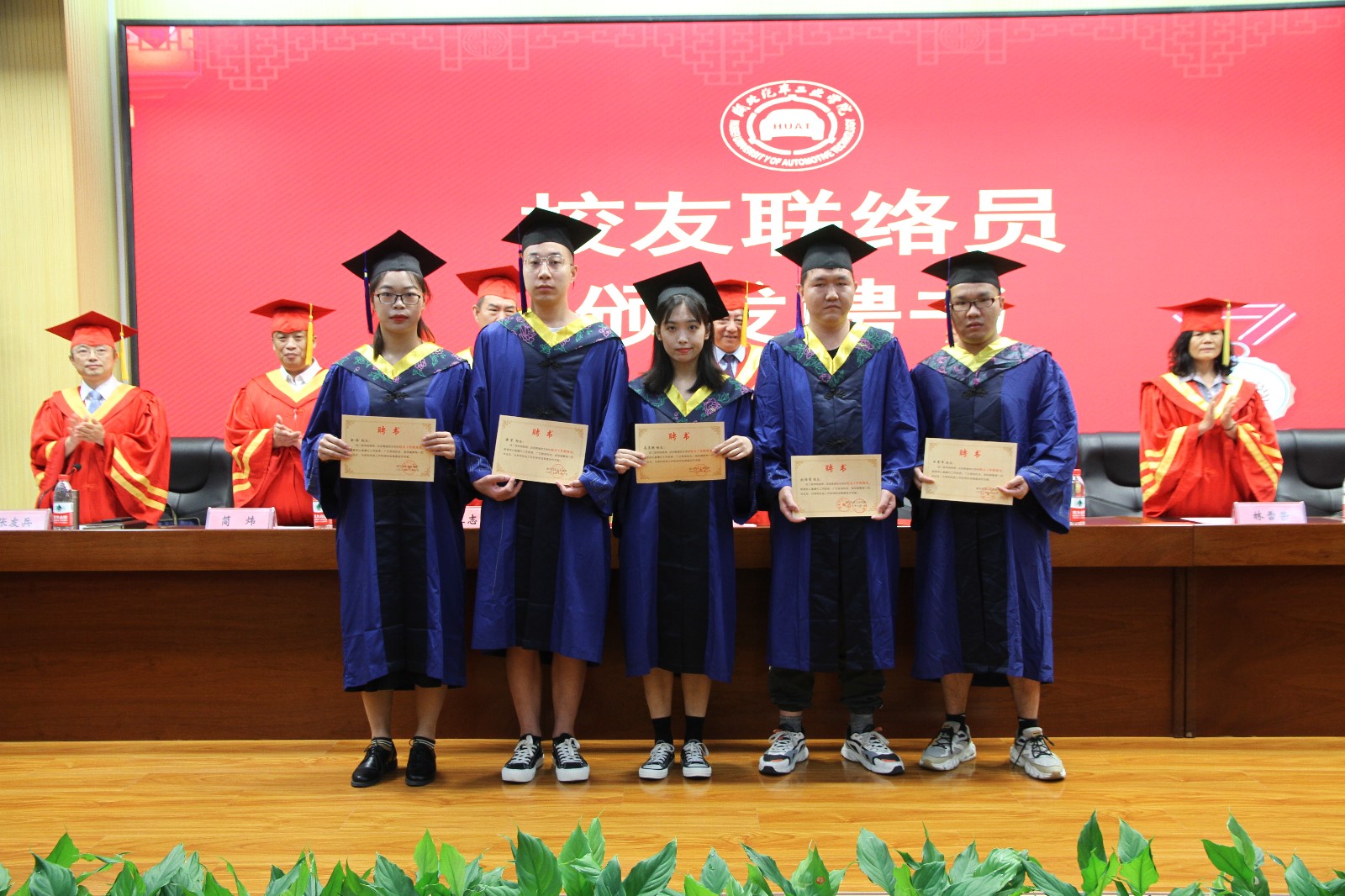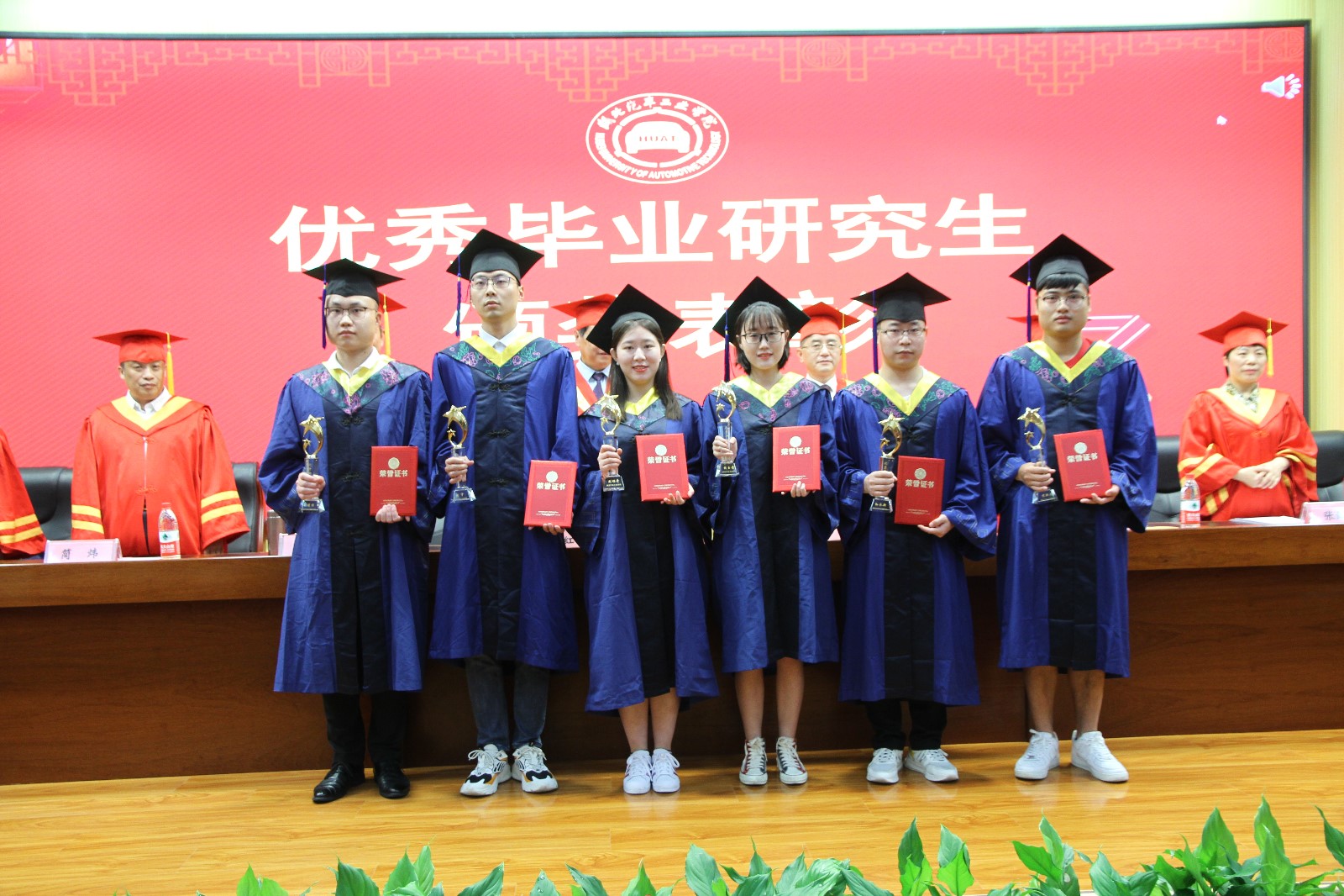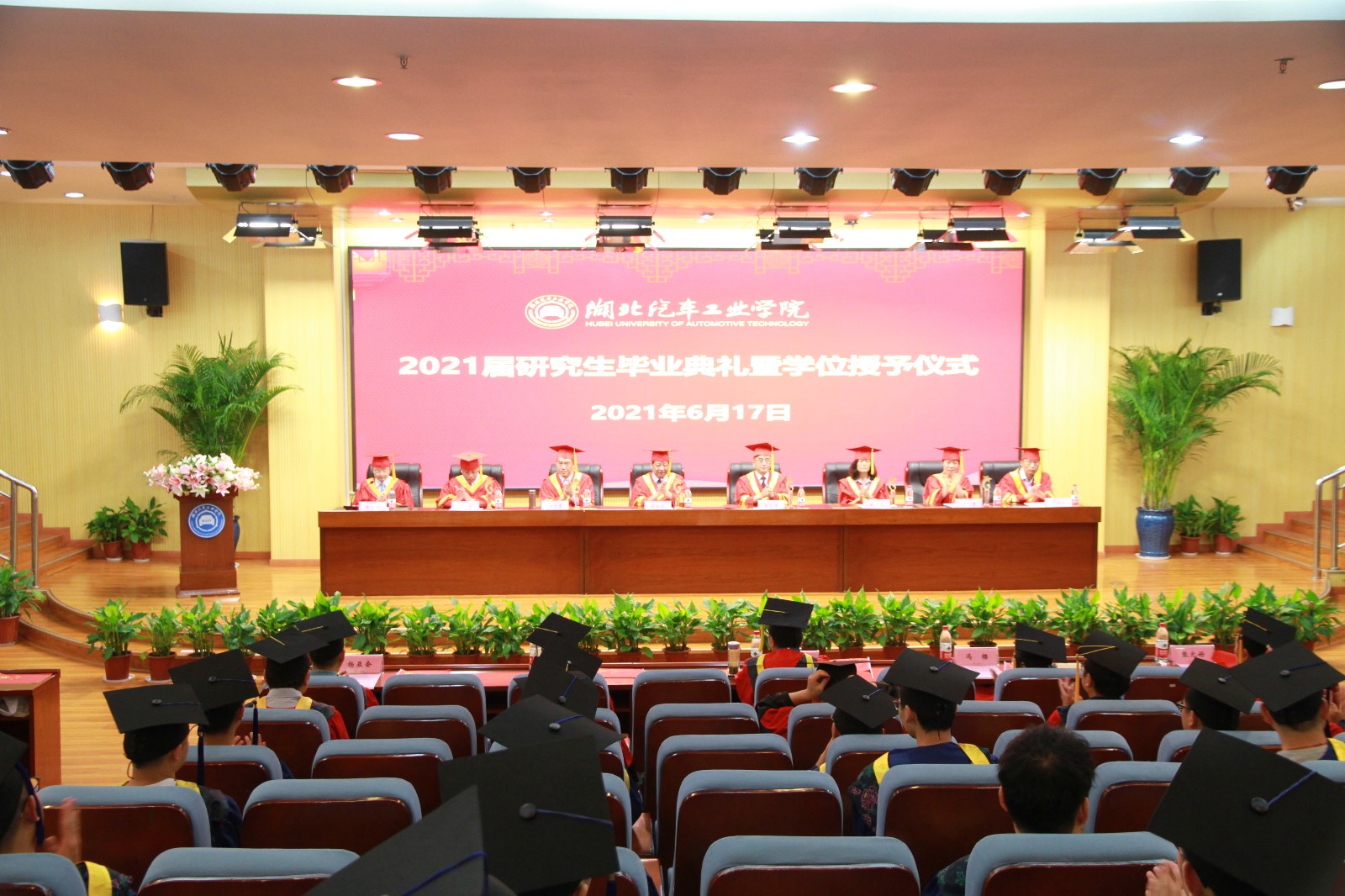 简伟副校长宣读了2021届硕士学位授予决定。全体校领导和二级学院院长为毕业生们一一拨苏正冠,授予学位证书,并合影留念。