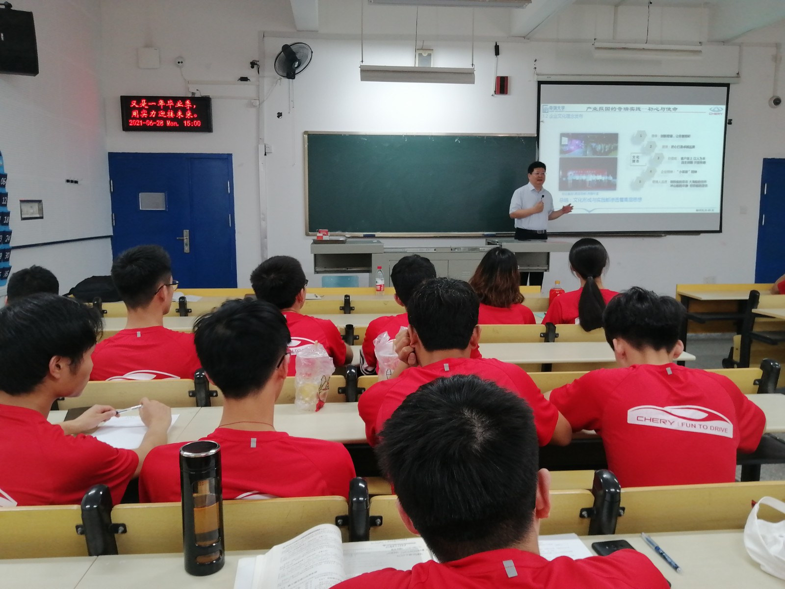 开班仪式后的第一课,由冯武堂亲授《奇瑞汽车发展史和奇瑞文化》。冯武堂从奇瑞成立初期的地方背景、团队背景、行业背景等方面系统真实地带同学们细品奇瑞发展史,奇瑞汽车发展的20年是中国民族汽车工业发展的20年。冯武堂现场和同学们交流提出“磨刀不误砍柴工”,结合自身及其他优秀领导人的经历现身说法,说明了生产一线岗位实习锻炼对于卓越工程师未来成长发展的重要性,鼓励同学们脚踏实地、点点积累都是为后面的爆发做准备!