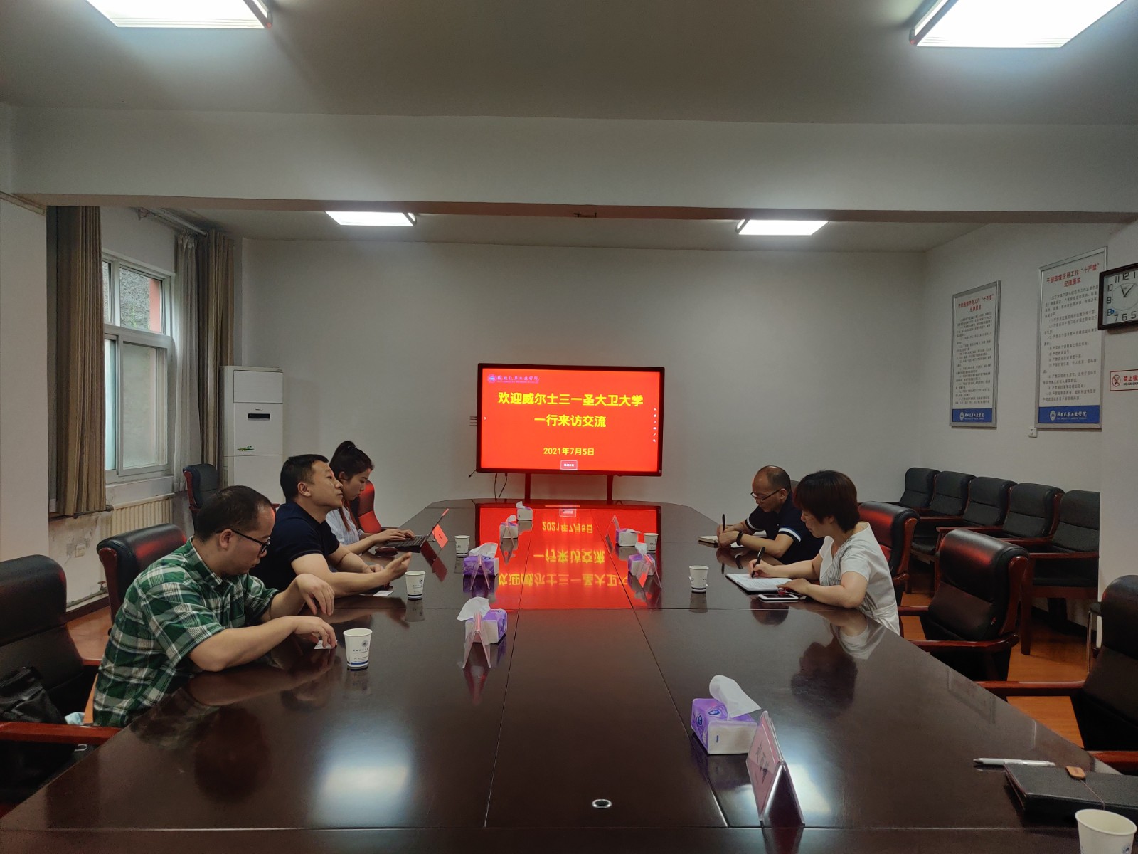 本网讯(文/赵雨晴)7月5日上午,英国威尔士三一圣大卫大学东亚办公室副主任陈志刚及项目主管胡安仪一行来英国上市公司365进行合作项目洽谈。副校长张红霞、国际合作交流处副处长苏子波参加了会议。