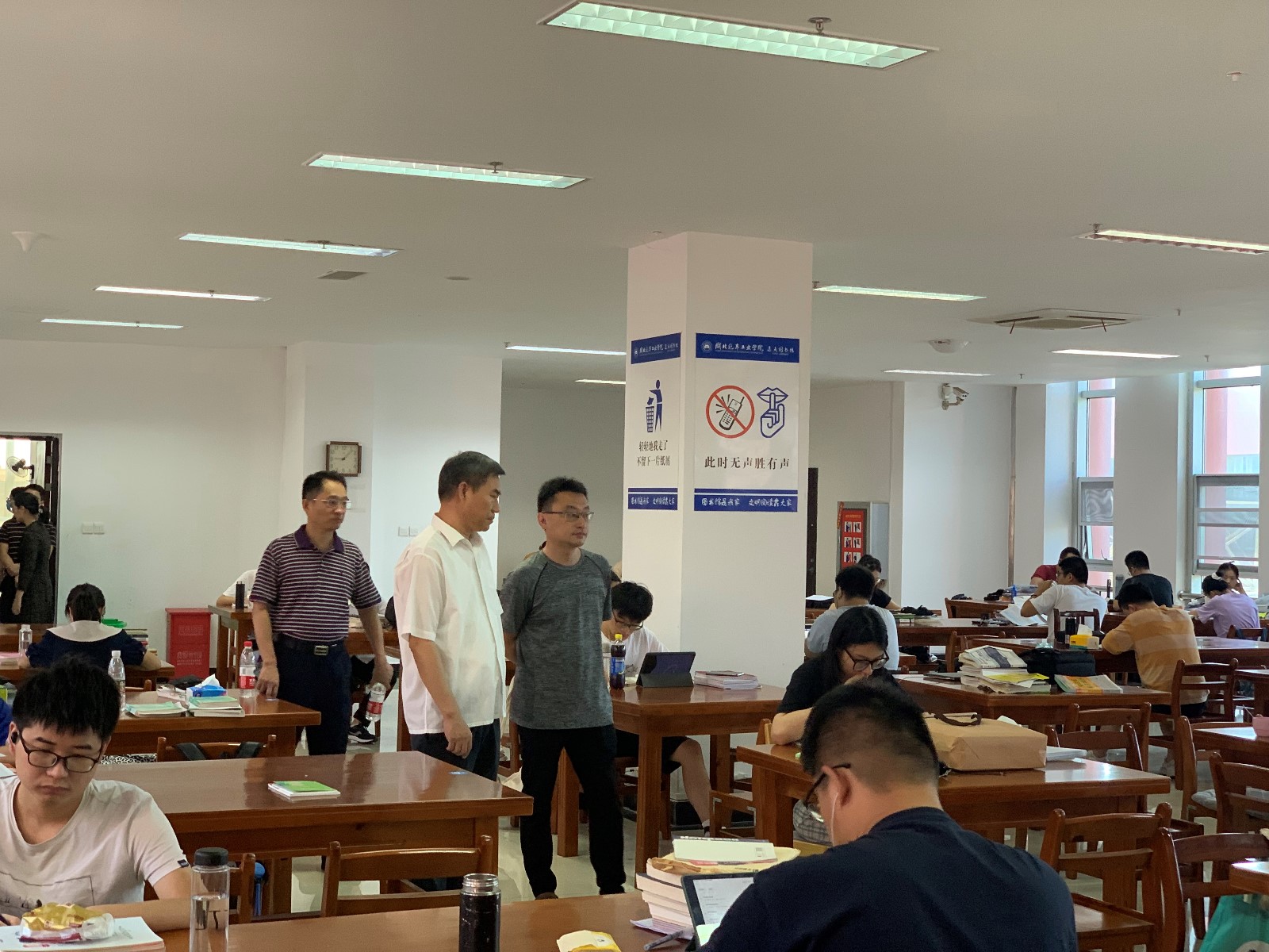 杨立志一行走访了图书馆自习室、HUAT车队、李园1#学生宿舍等地,察看了图书馆自习室等室内设备情况,对环境保障提出相关要求,深入与学生交流,代表学校向同学们表达了问候与关心,对同学们不畏高温酷暑,复习考研、参加科研竞赛等拼搏精神表示赞赏,并为参与学科竞赛的学生团队送去防暑降温慰问品,勉励同学们要树立信心,明确目标,保持积极的心态,合理安排作息时间,科学安排饮食搭配,注重劳逸结合,提高学习工作效率。