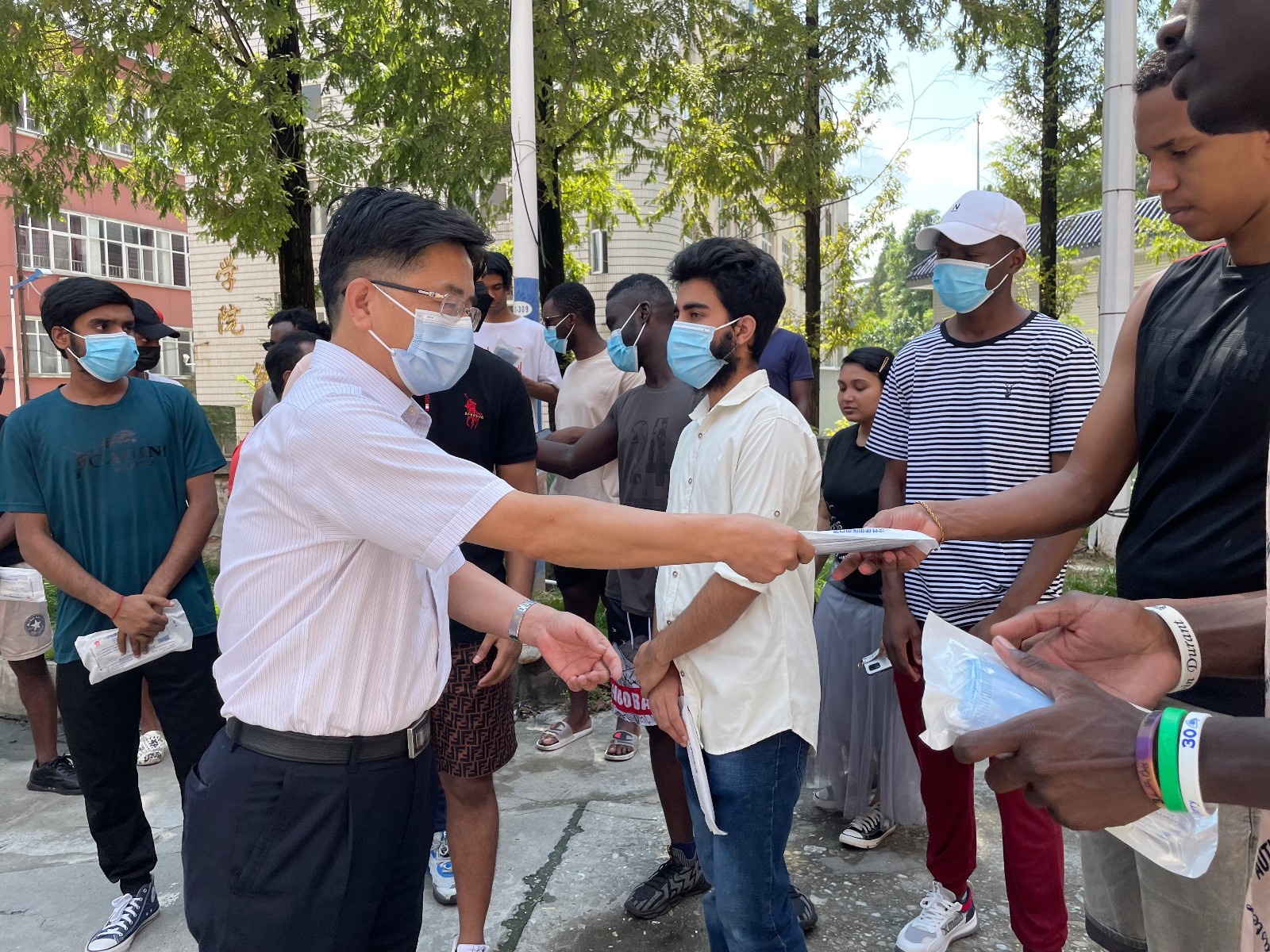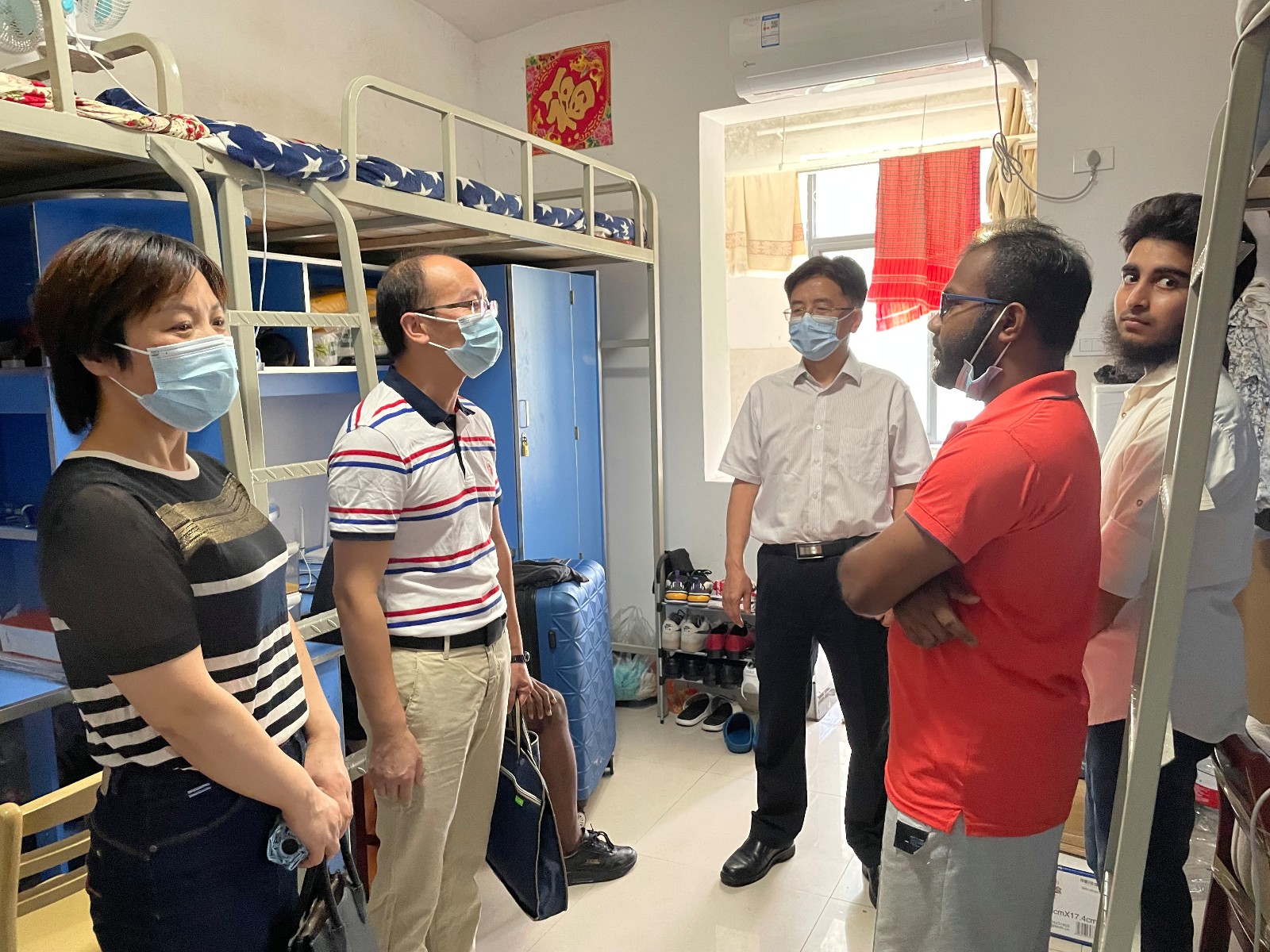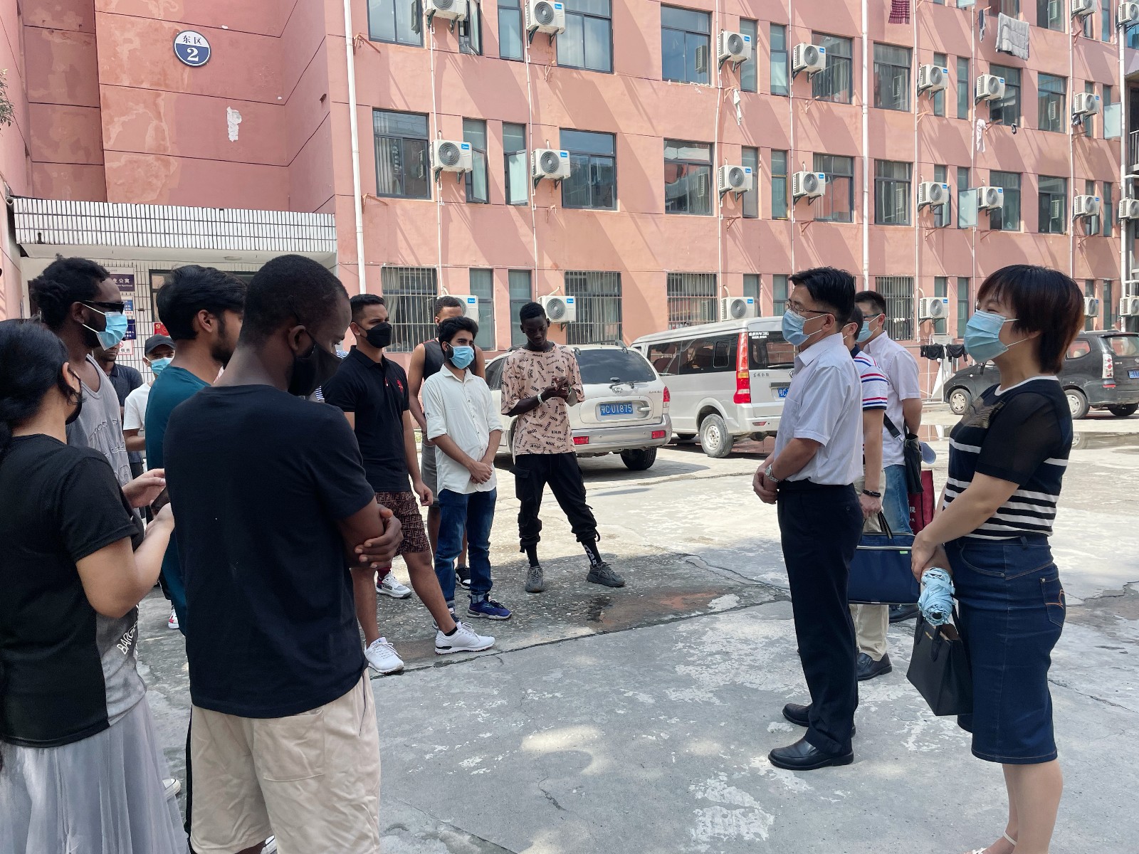 本网讯(文/图 张婷婷)正值疫情防控严峻时期,为深入了解在校留学生的学习及生活状况,增强留学生安全意识,做好留学生疫情防控工作,8月9日下午,校长张文学、副校长张红霞带队走访看望在校留学生,校办副主任郭义坤、国际处副处长苏子波、留学生科科长方鹏、留学生辅导员张婷婷陪同走访。