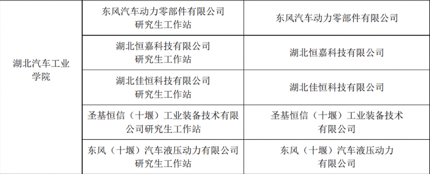 本次入选的研究生工作站特色鲜明、研究生培养效果显著,其中,学校与东风汽车动力零部件有限公司建立的研究生工作站,在技术研发、产品开发、项目申报、成果培育、资源共享等方面开展了长期稳定扎实的合作,为研究生培养提供了师资、技术、平台、环境等各方面的优质资源,极大地提升了学生研究创新实践能力,形成了具有优势特色的产教融合机制。学校与湖北佳恒科技有限公司建立的研究生工作站,建立了“八共”全方位协同培养的运行机制,即“共商、共立、共施、共改、共建、共享、共管、共评”。学校与企业深度融合,依托技术研发、产品开发等合作项目培养研究生实践创新能力。