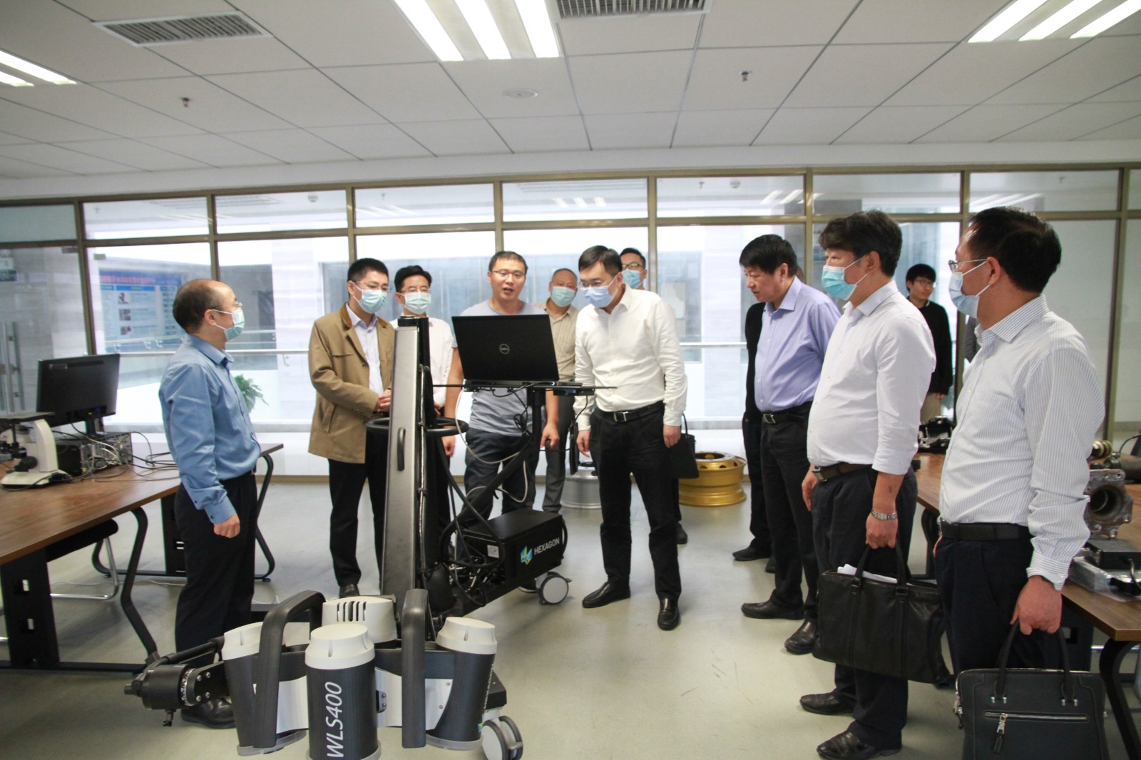 张澍一行在程红兵等陪同下实地参观了中国工程科技十堰产业技术研究院检测中心、学校校史馆、国家级制造装备数字化分中心、大学生方程式赛车创新基地和汽车材料研发平台,与相关平台负责人进行了亲切交谈。