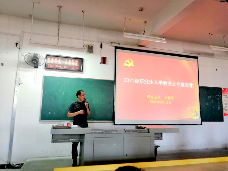 9月11日下午,研究生处分党委副书记杜祥军为新生上了一堂以“在党旗下集合”为主题的专题党课。介绍了举办党课培训班的意义和学习党的理论知识的重要性。同时,要求同学们正确认识党课培训的目的,明确党员标准,从而严格要求自己,提高思想觉悟,积极向党组织靠拢。并对已经成为正式党员的同志提出了几点要求,希望他们认真参加组织活动,不断加强理论学习,提高自身党性修养,发挥好先锋模范作用,以更高标准要求自己,团结带领身边同志一起进步。不负青春韶华,为实现中华民族伟大复兴的中国梦砥砺前行。