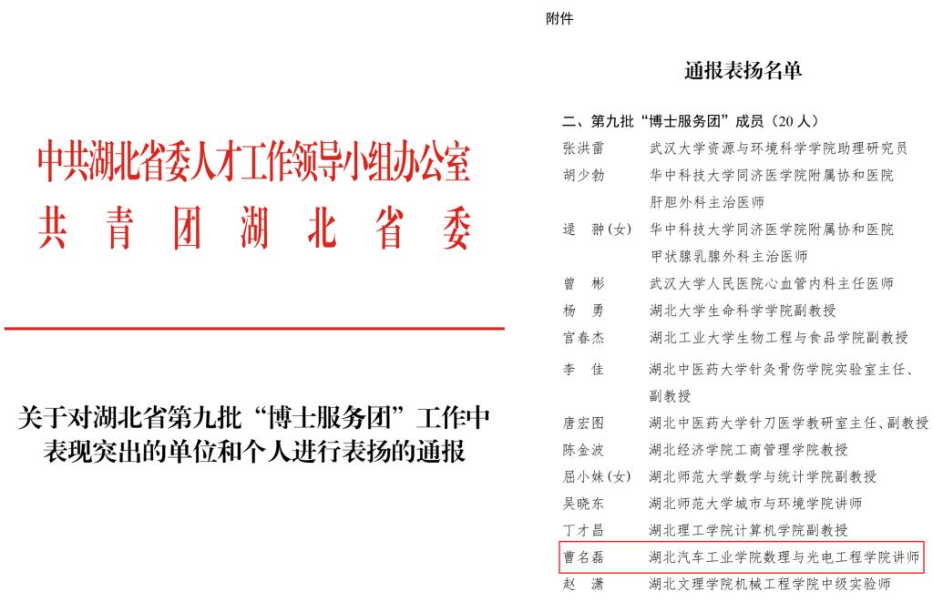 本网讯(文/张传坤)9月23日,湖北省委组织部、共青团湖北省委在武汉召开了湖北省“博士服务团”第九批总结暨第十批动员培训会,并对第九批“博士服务团”工作中表现突出的单位和个人进行了通报表扬。英国上市公司365曹名磊博士因“博士服务团”工作出色,位列通报表扬名单之中。据悉,在参加第九批“博士服务团”的100名博士中,仅有20人获此殊荣。