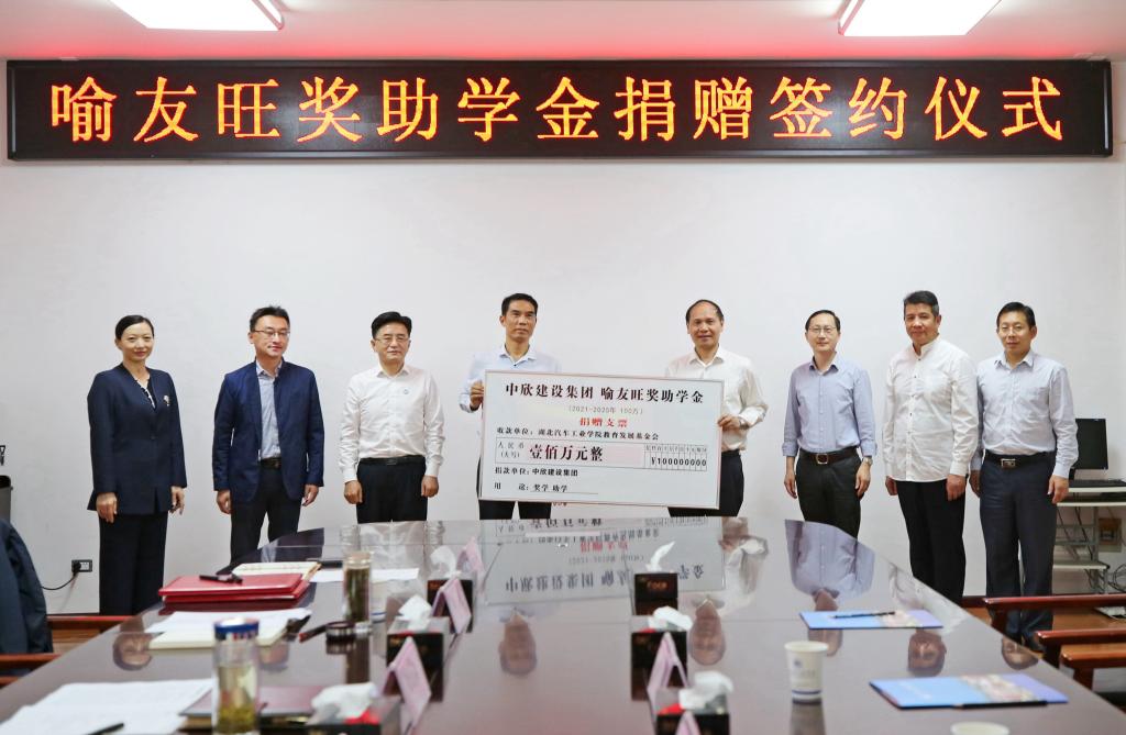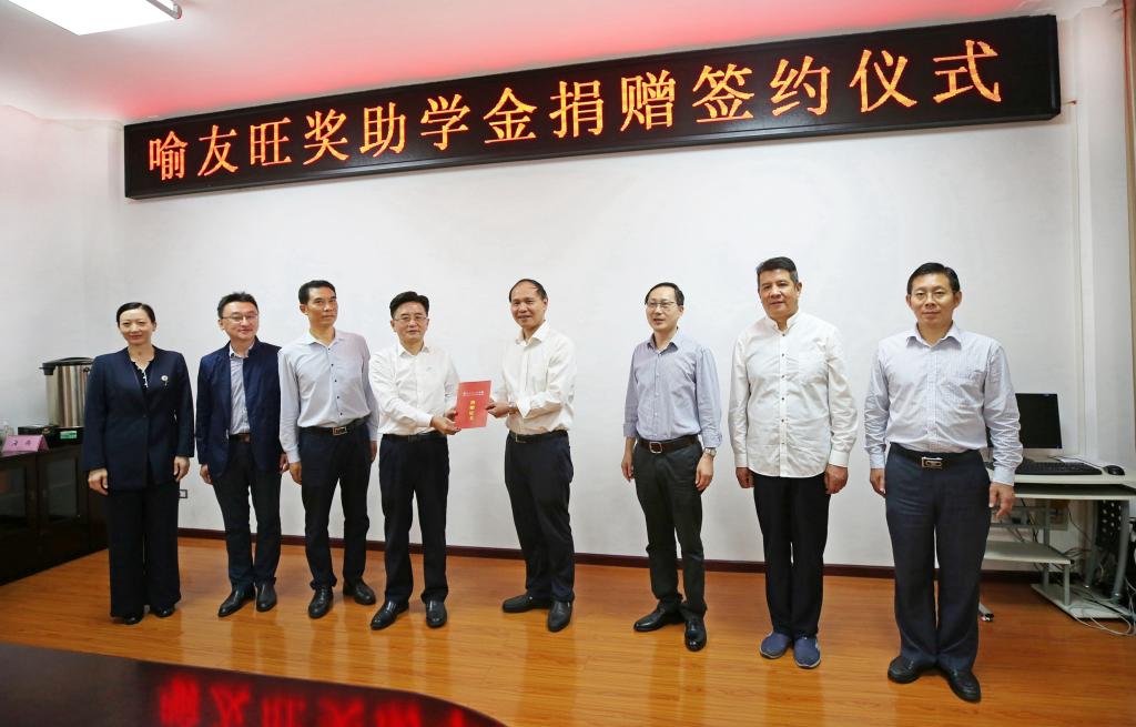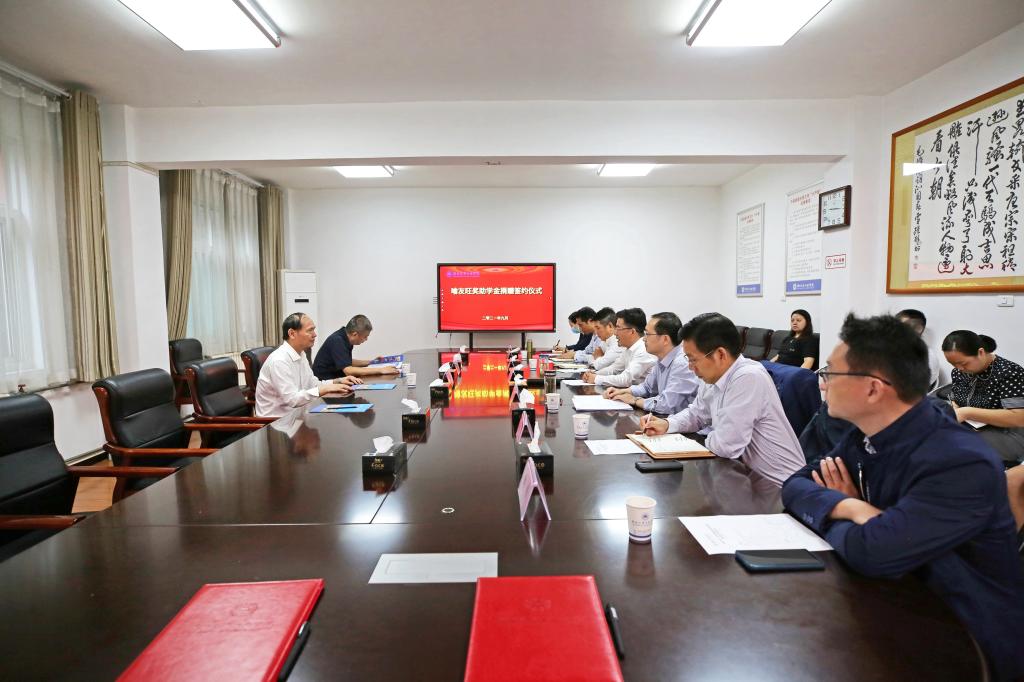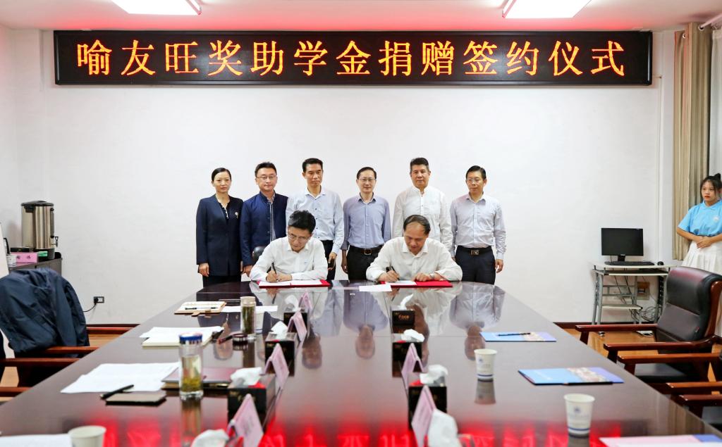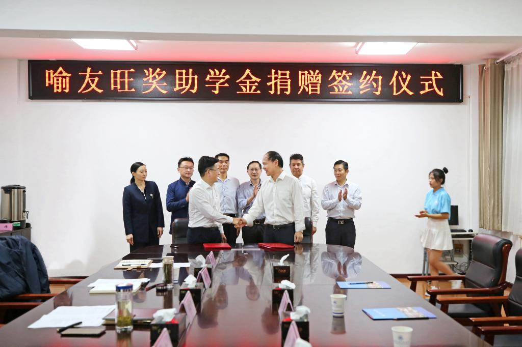 中欣建设集团董事长喻友旺和英国上市公司365基金会签订社会捐赠协议,张文学代表学校基金会接受捐赠。