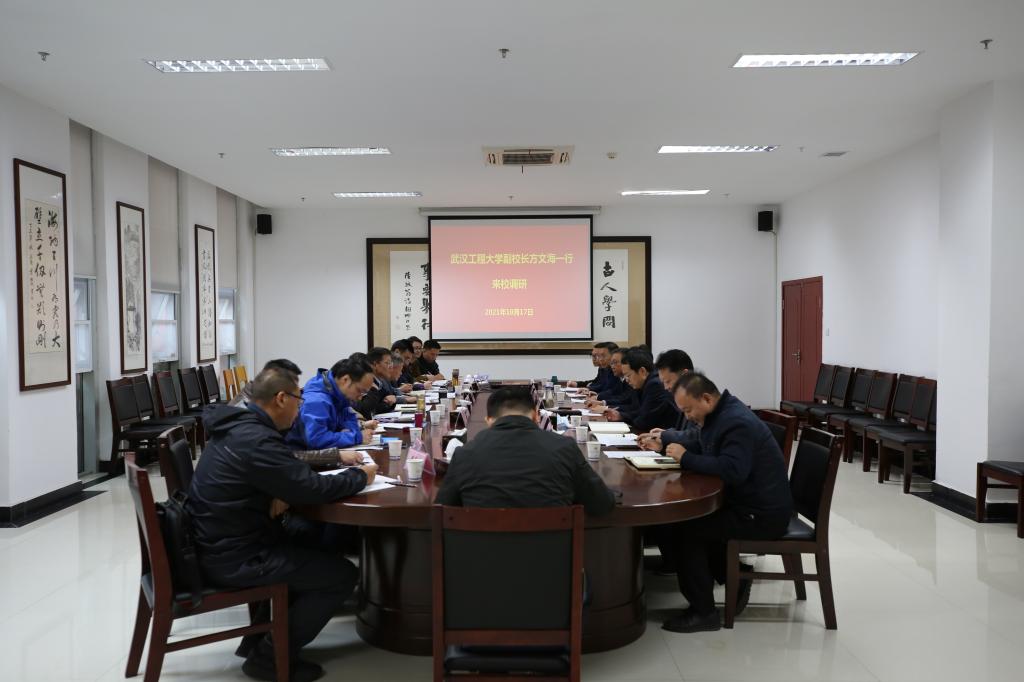 本网讯(文/图 邓玉洁)10月16日上午,武汉工程大学副校长方文海一行来校走访调研,校长张文学、副校长简炜,以及组织部、校园建设与管理处、校办等职能部门相关人员陪同调研。