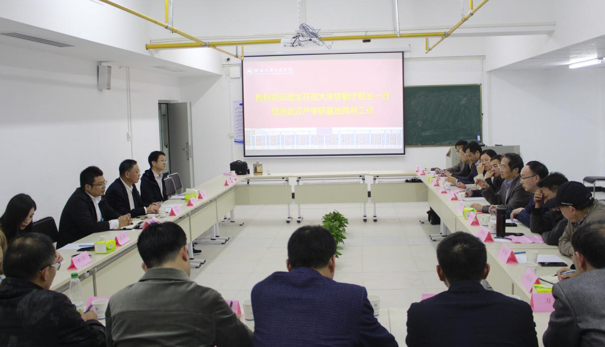 在基地205教室,郭都玺就基地发展历程、基地目标定位及基地建设情况进行了汇报。与会人员围绕产教融合、校企合作途径与方法、技术创新与社会服务举措、基地建设体制与运行机制、共建联合体以及校友工作进行了深入探讨和交流。受邀参会的东风技术中心周海鹰总师、东风悦享科技有限公司郭晟玮总监从企业角度谈了高校建设产学研基地的意义和作用。他们认为,虽然学术界与企业界是两个完全独立的系统,但高校是科研成果的主要提供者,企业是科研成果的需求者,两者应是建立在供求需求上的合作关系,特别是如今企业对高素质复合应用型人才的需求存在一定缺口,所以为了改变这一现状,加快推进产学研合作势在必行。钟毓宁对武汉基地的建设表达出赞赏与欣慰。他指出,在职业教育蓬勃发展的浪潮中,湖北开放大学也应抓住机会,坚持校企合作,鼓励老师、学生“走出去”,力争实现优势互补,为社会、企业培养符合时代要求的后备人才。