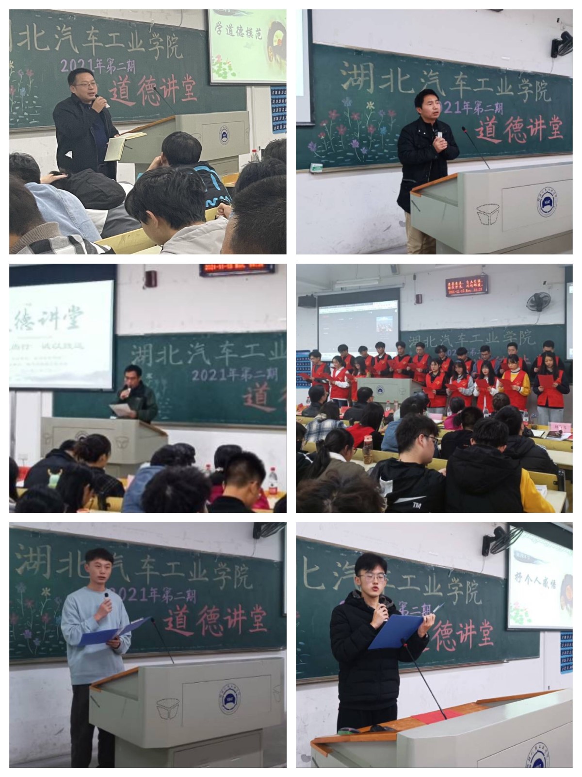活动有自我反省、诵道德经典、学道德模范、抒个人感悟、唱道德歌曲、向德、诚致敬、我承诺·我担当等7个环节。常言道“吾日三省吾身”,适时自省,做好反思,让学生发现自己在生活与学习中存在的不足并加以警醒。陈战锋带领全体人员诵读《劝学》经典诗篇,让同学们在诵读中品味“道德”“情操”“品性”“气质”等人文素养,陶冶情操。程登良围绕“为师、为学、为人”给大家分享自己的感悟。程老师结合《道德经》中道、德二字的讲述,提倡将平和的心境带入日常的生活与学习中,用来抵御环境的躁动,从而能够潜心治学。