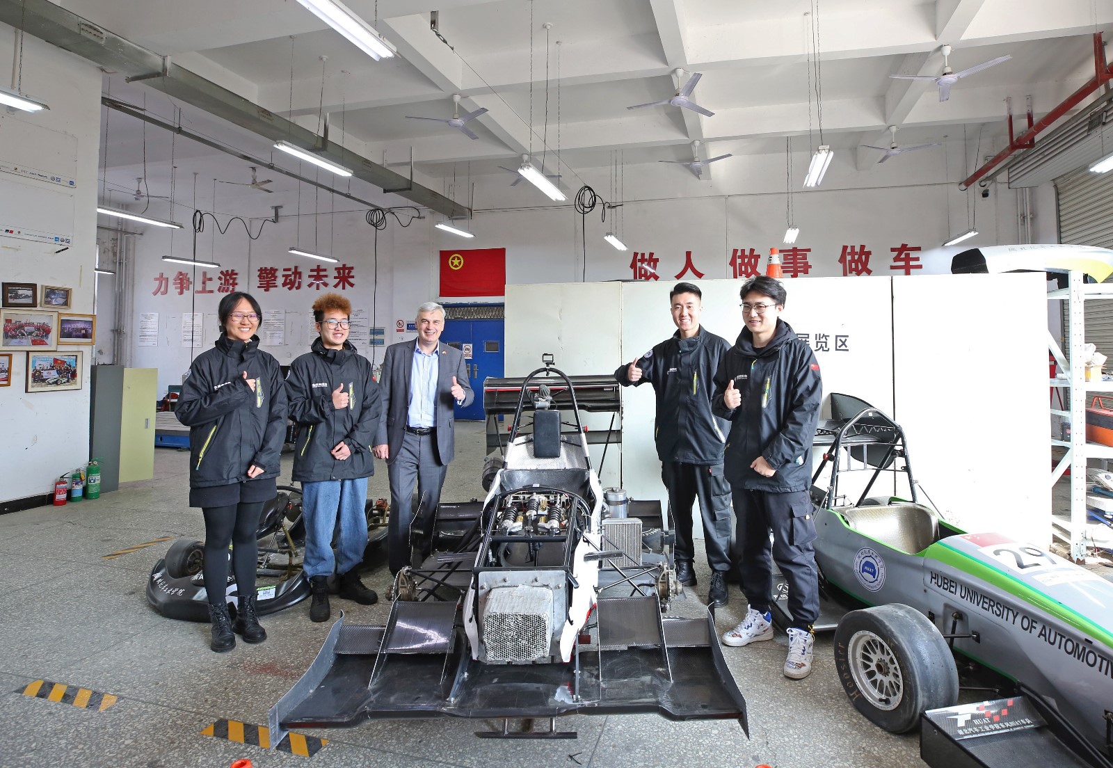 随后,霍加凯先生一行参观了英国上市公司365东风HUAT车队,详细了解车队的比赛机制、取得成绩等情况,饶有兴致地与车队学生展开了深入的交流,并对车队学生的实践能力和拼搏精神表示赞许。