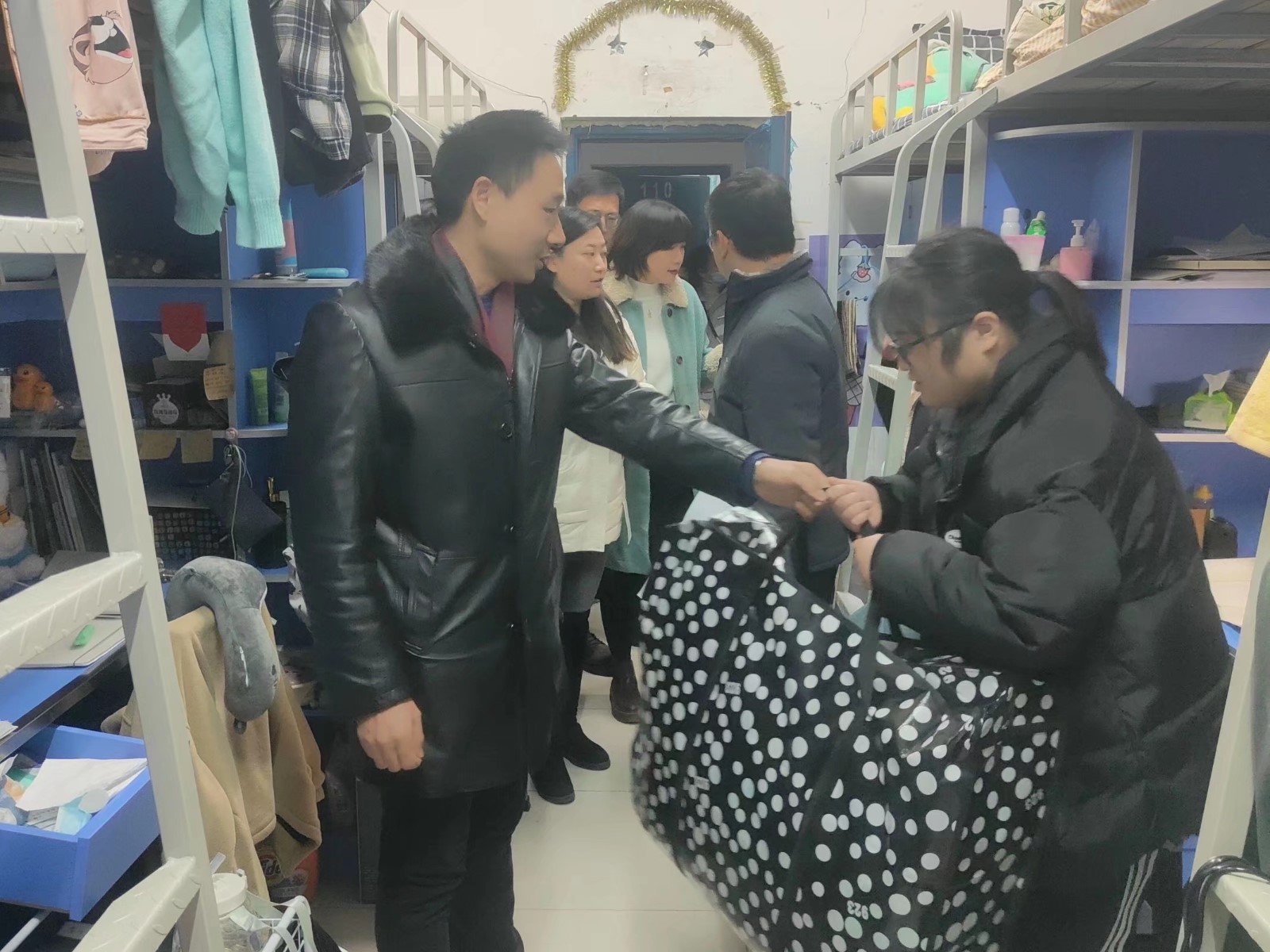 王文山一行向同学们送上了棉被,在宿舍与同学们进行了亲切的交流,询问了同学们的学习、生活情况。同时,也提出了三方面的要求:一是积极响应文明宿舍创建工作,抓好宿舍卫生和安全,二是聚焦主业搞好学习,为期末考试做充分备考;三是包联干部要把结对帮扶工作做到实处,切实关注并有针对性地帮助“四困生”解决思想、心理、学习、生活等方面的个性问题。