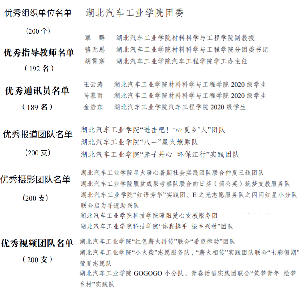 其中,学校团委荣获社会实践“全国优秀组织单位”;覃群、骆无思、胡霄寒3名老师荣获社会实践“全国优秀指导老师”;王云涛、马慕雨、金浩东3名学生荣获社会实践“全国优秀通讯员”;科院向日葵(蒲公英)筑梦服务队荣获社会实践“优秀实践团队”;“进击吧!‘心夏乡’人”团队等3个团队荣获社会实践“全国优秀报道团队”;“星火暖心”暑期社会实践团队等5个联合团队荣获社会实践“全国优秀摄影团队”;“红色薪火再传”实践团队等3个联合团队荣获社会实践“全国优秀视频团队”。