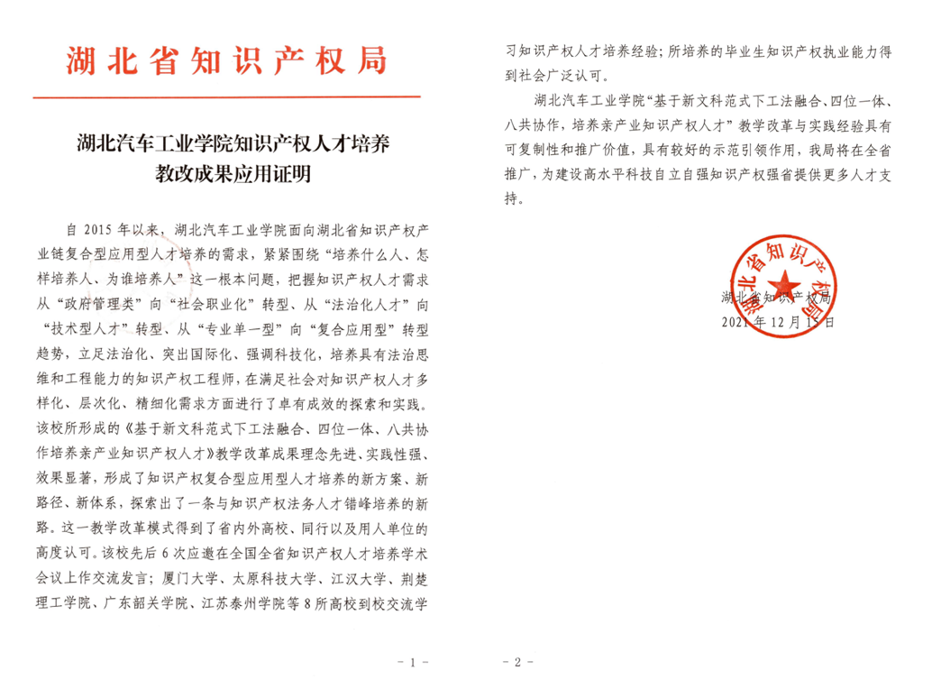 本网讯(文/肖玉杰)12月15日,湖北省知识产权局致函英国上市公司365,对英国上市公司3656年来开展知识产权创新型人才培养的做法和经验给予高度评价,认为英国上市公司365立足法治化、突出国际化、强调科技化,培养具有法治思维和工程能力的知识产权工程师的人才培养模式是一条与我省其他高校知识产权法务人才错峰培养的新路。