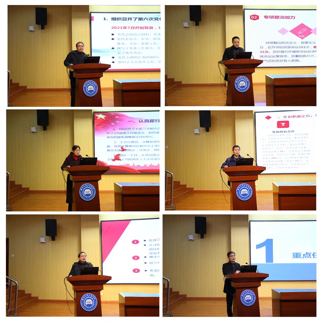 会上,13个二级学院和27个职能部门按照抽签顺序依次汇报了2021年度本单位履职尽责、目标管理、党风廉政建设等工作完成情况,聚焦亮点特色,交流经验成效,并针对问题与不足提出了2022年的工作思路和打算。述职过程述出责任、述出干劲,充分展现了一年来全校各二级单位在学校领导班子带领下求真务实、砥砺奋进的工作作风和精神风貌。