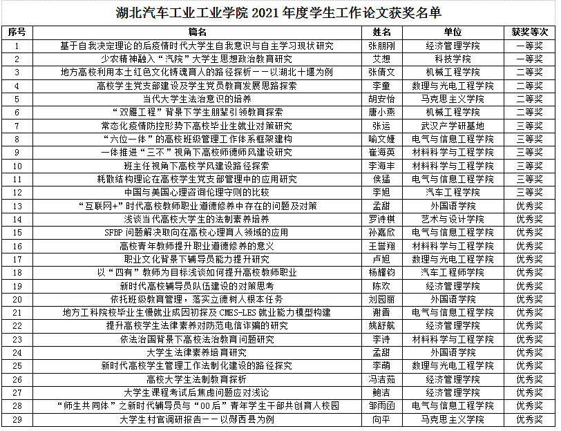 现场还公布了2021年度学生工作优秀论文评选结果,29篇论文分别获一二三等奖和优秀奖,其中一等奖2篇,二等奖4篇,三等奖6篇。