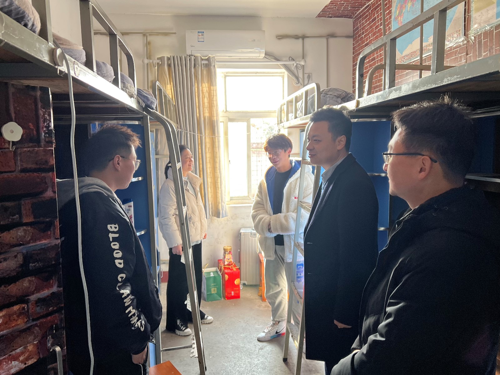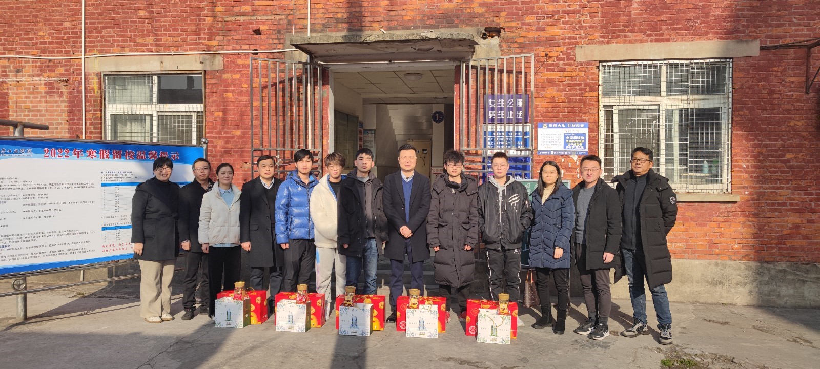 高刃一行走访了假期集中住宿的宿舍西区3号楼、校内疫情防控集中居家隔离点等地,察看了学生宿舍等室内设备情况,并为留校学生送上新春慰问礼品。