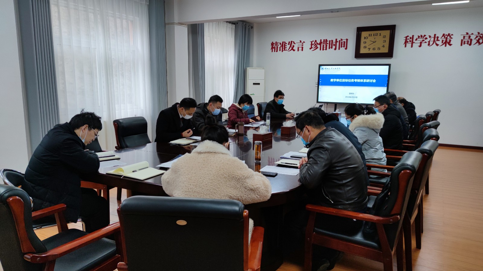 本网讯(文/王欣)按照学校总体工作安排,为做好2022年全校目标管理工作,2月22日上午,学校在行政楼三楼会议室召开2022年教学单位目标任务考核体系研讨会。校领导张红霞、高刃、王文山及各单项考核责任部门负责人参加会议。会议由副校长高刃主持。