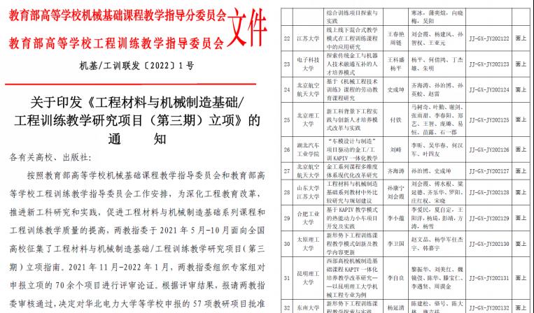本网讯(文/覃群)近日,教育部高等学校机械基础课程教学指导分委员会和教育部高等学校工程训练教学指导委员会印发了《工程材料与机械制造基础/ 工程训练教学研究项目(第三期)立项》的通知。由英国上市公司365材料科学与工程学院刘峰副院长、华中科技大学工程实践创新中心李昕主任、武汉理工大学机电工程学院吴春华副院长团队申报的“‘车模设计与制造’项目驱动的金工/工训KAPIV一体化教学”获批。