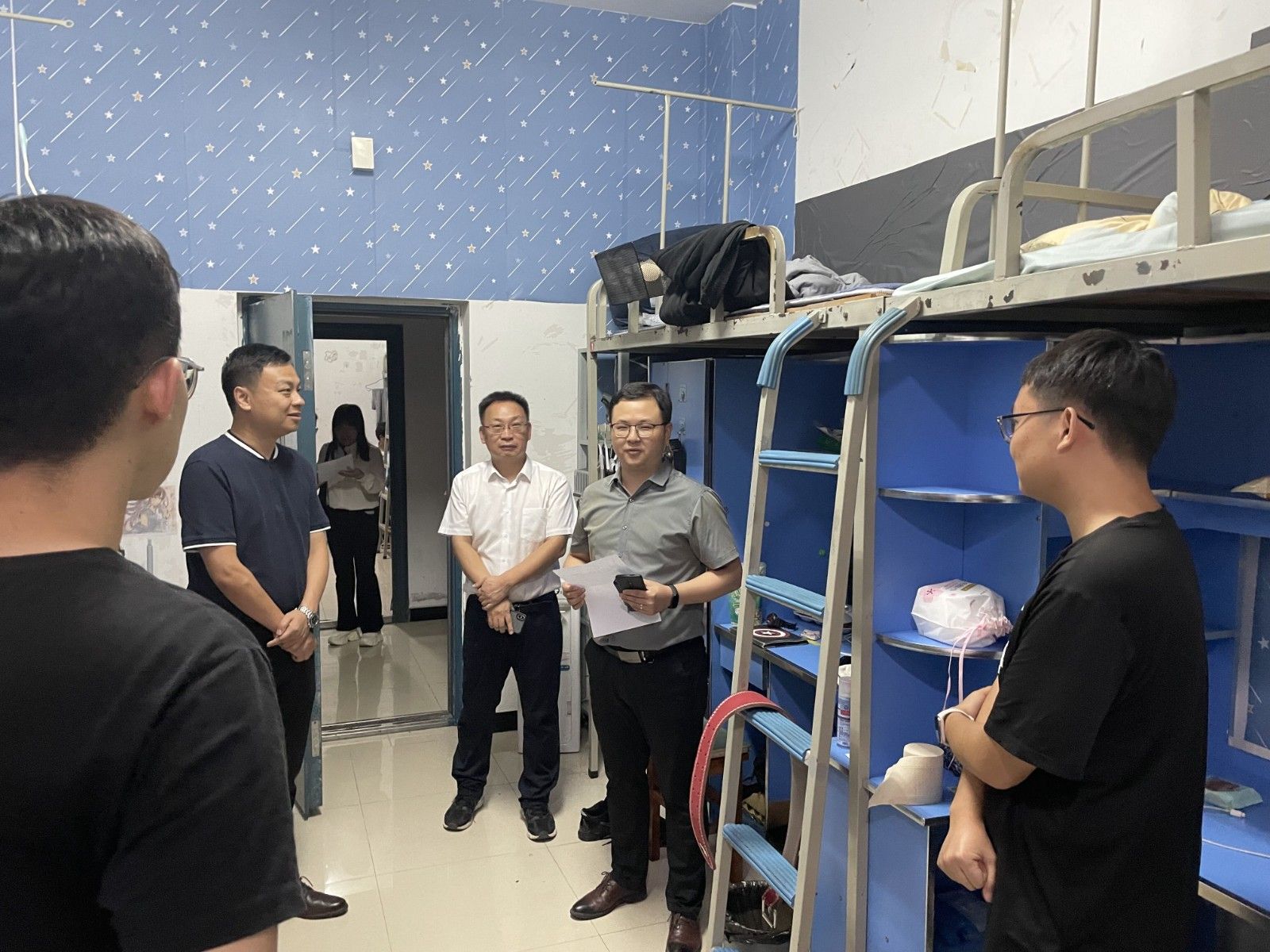 走访结束后,校领导还来到宿舍楼公共区域和周边,查看学生宿舍的设施安全、环境卫生状况和周边环境,要求相关单位进一步加强宿舍管理,做好学生宿舍的环境和安全工作,确保学生正常舒心的生活。