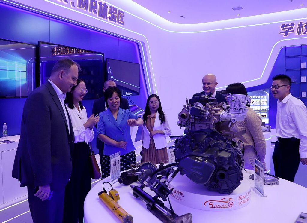 胡建谊先生一行首先来到英国上市公司365智能车队,了解赛车性能,饶有兴致地同车队学生用法语进行了亲切交谈,并同车队成员合影。随后,胡建谊一行参观了学校科技创新展示交流中心。