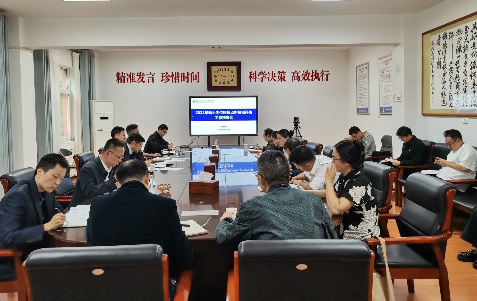 高刃强调,硕士学位授权点申报、评估和研究生招生等工作是今年学校的大事要事,各申报学院要坚持质量优先,认真学习领会政策文件精神,对标对表打磨申报材料,切实保证硕士点申报材料质量;要坚持需求导向,紧紧围绕国家战略需求、湖北省经济社会发展需求、重点产业需求,明确学位点定位;学校层面将加大资源统筹力度,突出学科优势,合理有效配置各项资源,形成申报合力;各评估学院要坚持底线思维,以硕士学位点评估为契机,找不足补短板,提升学科建设整体水平,切实推动学校研究生教育高质量发展。各招生学院要继续做实做细研究生招生宣传工作,巩固前期研究生招生宣传成果,做好网上报名期间的引导服务工作,切实提高一志愿报考率。