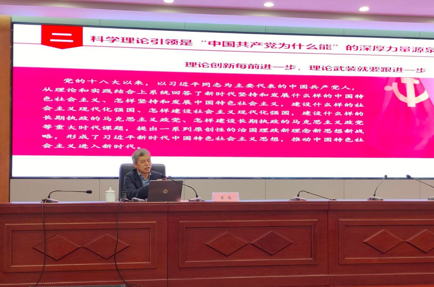 第二场报告会上,李俊以“中国共产党为什么‘能’?”为题,从远大理想追求、科学理论引领、坚持人民至上、中国共产党独特的组织优势、严明纪律规矩、自我革命精神、强大领导能力、坚持和平发展等八个方面阐释了这一问题。深入浅出的讲解,娓娓道来的分析,引起了师生共鸣,现场氛围热烈。