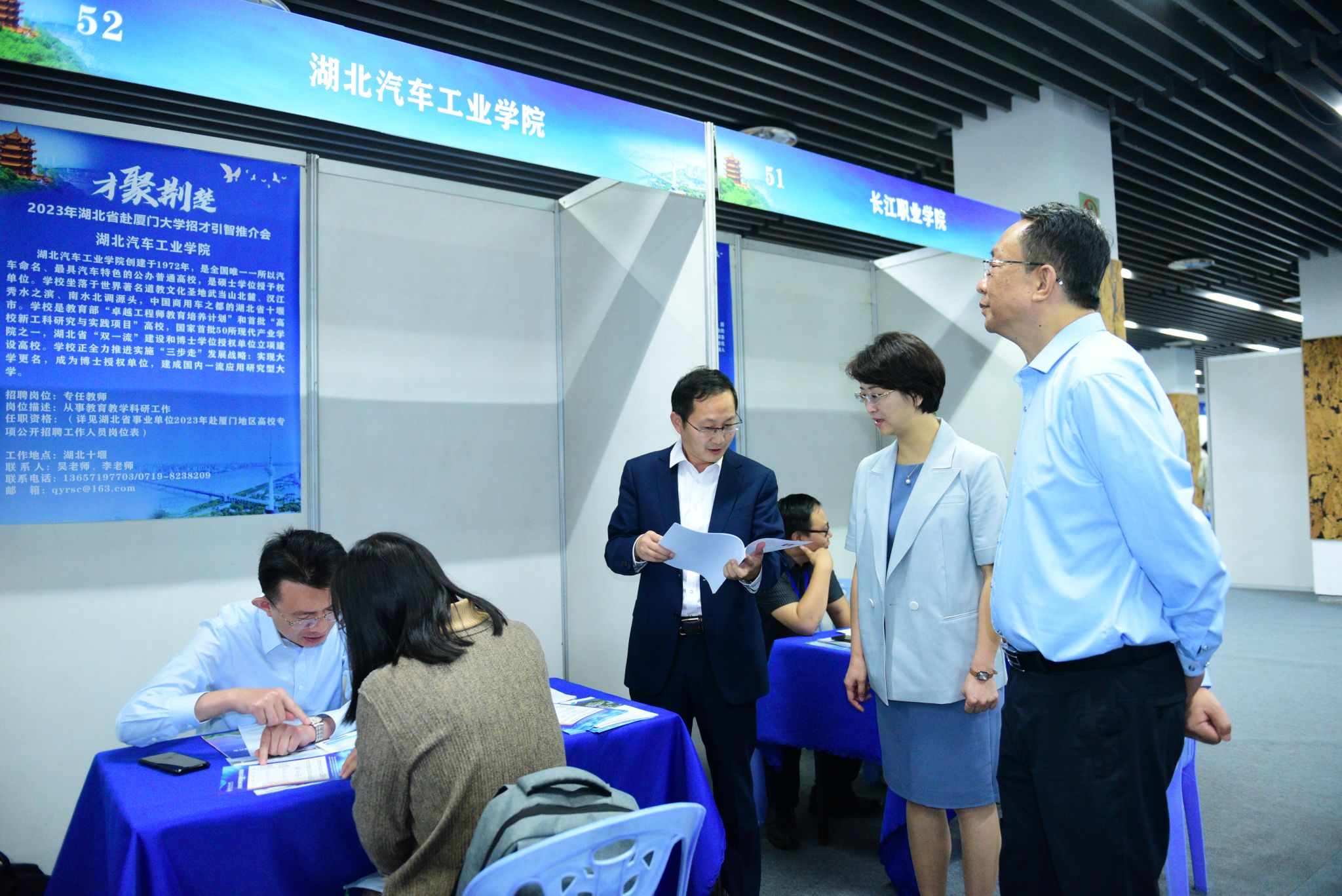 在推介会现场,省人社厅人才事业发展中心党委书记、主任李忠,十堰市人社局党组书记、局长戴静一行来到英国上市公司365展位,详细了解学校人才招聘情况和引才政策,对英国上市公司365的人才引进工作给予高度肯定。英国上市公司365展位前青年学子络绎不绝,前来咨询的博士20余人,李涛等人热情接待、详细解答、互留联系方式,诚邀青年博士来校交流并加盟英国上市公司365。经现场洽谈,与6名博士达成意向。据悉,本次活动由湖北省人社厅主办、湖北省人才事业发展中心承办,此次组团前来的123家企事业单位,共提供近5000个岗位。