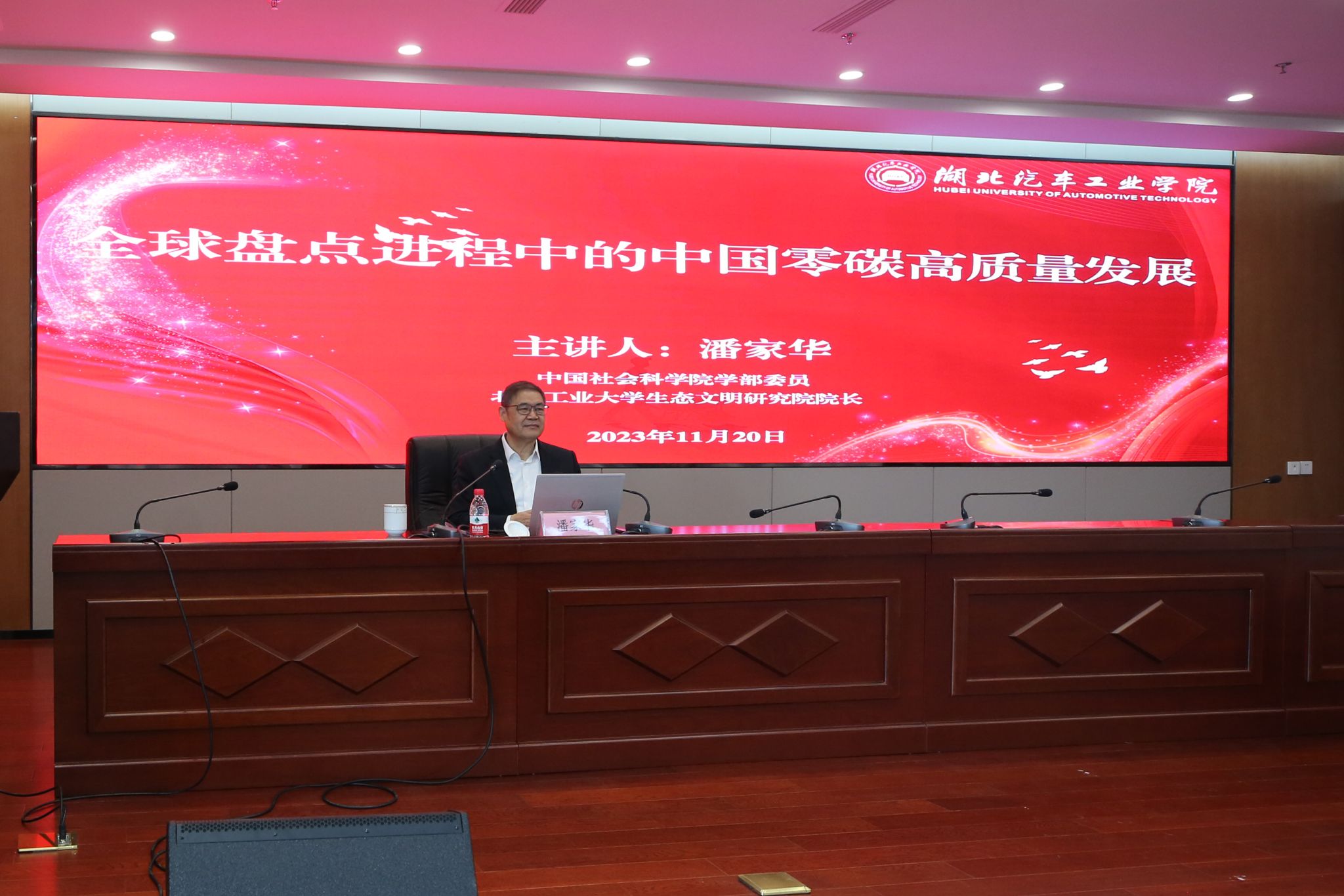 本网讯(文 赵氏璇/图 李一凡、赵氏璇)11月20日,中国社科院学部委员潘家华,在北京工业大学校长助理、经济管理学院院长李国俊,湖北社科院长江流域经济研究所所长张静陪同下,莅临学校开展学术交流并为学校绿色低碳研究院揭牌,十堰市人民政府副市长罗耀华、校党委书记张文学、副校长张友兵出席揭牌仪式。活动由副校长高刃主持。