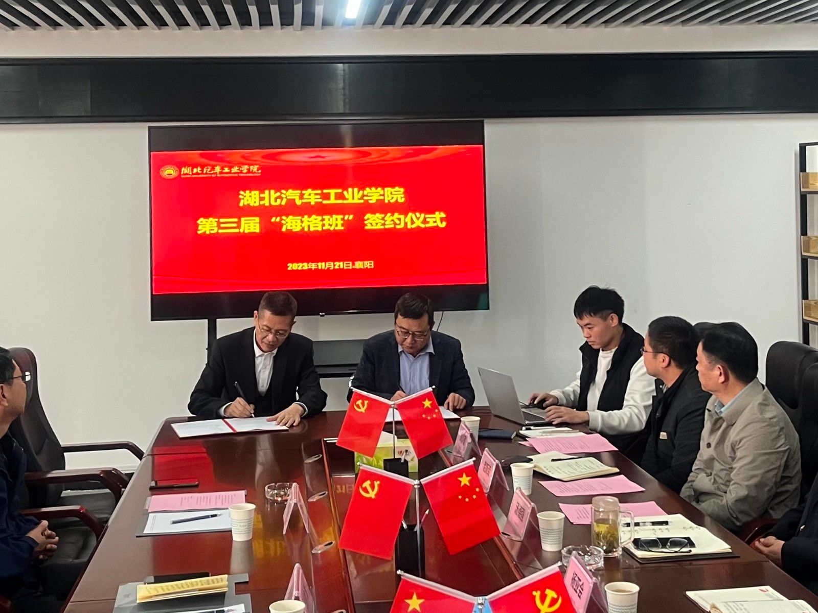 本网讯(文/雷金瑾)11月21日上午,学校与苏州金龙海格客车有限公司(简称“海格客车”)产学研合作项目签约仪式暨第三届“海格班”开班仪式在襄阳产学研基地604会议室顺利举行。海格客车人力资源总监秦志飞、技术中心首席工程师陈志龙、人力资源部招聘经理雷鸣,校汽车工程学院分党委书记杨亚会、冯樱教授及相关部门负责人,襄阳产学研基地主任汤德强、副主任赵新军、副书记余厚德及学生代表出席仪式。仪式由冯樱主持。